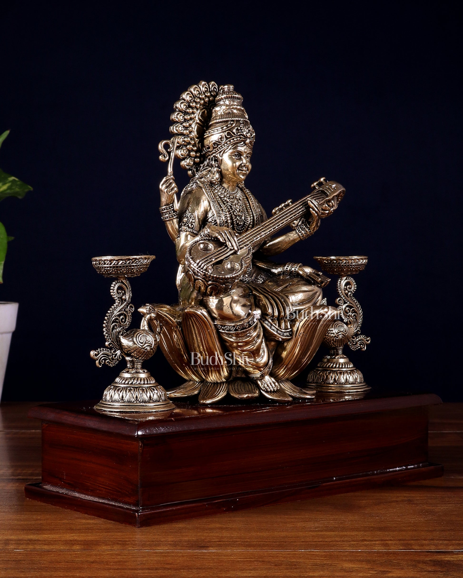 Brass Superfine Goddess Saraswati Idol with Twin Peacock Lamps on Wooden Base – 9.5 Inch