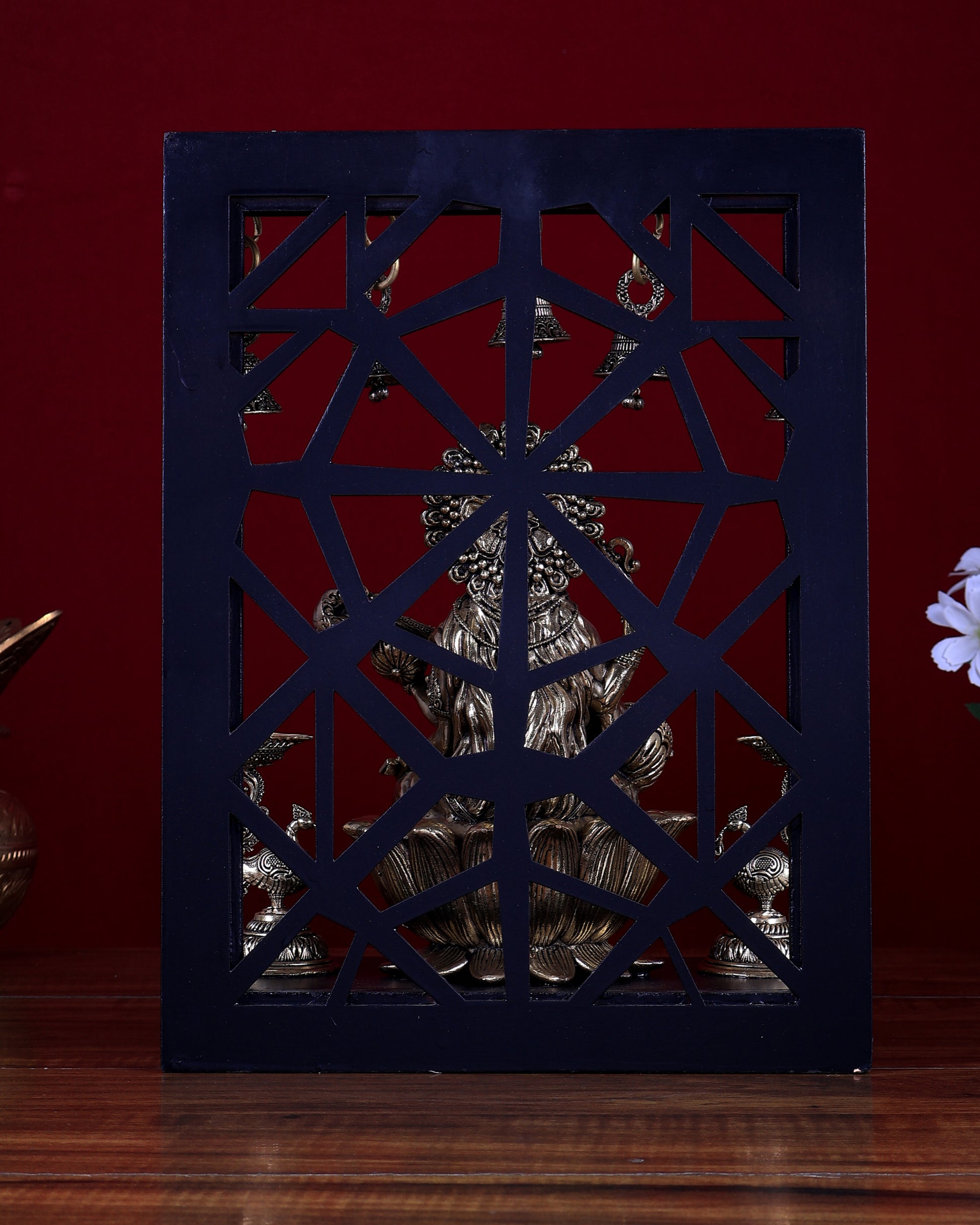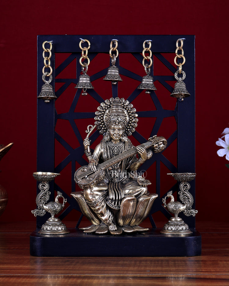 This Brass Superfine Goddess Saraswati on Lotus mounted on a finely crafted MDF temple panel beautifully represents knowledge, wisdom, music, and learning. Seated on a lotus, Goddess Saraswati embodies purity and enlightenment, while the Annam lamps and hanging bells add a sacred, temple-like ambience ideal for daily worship.