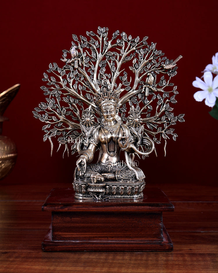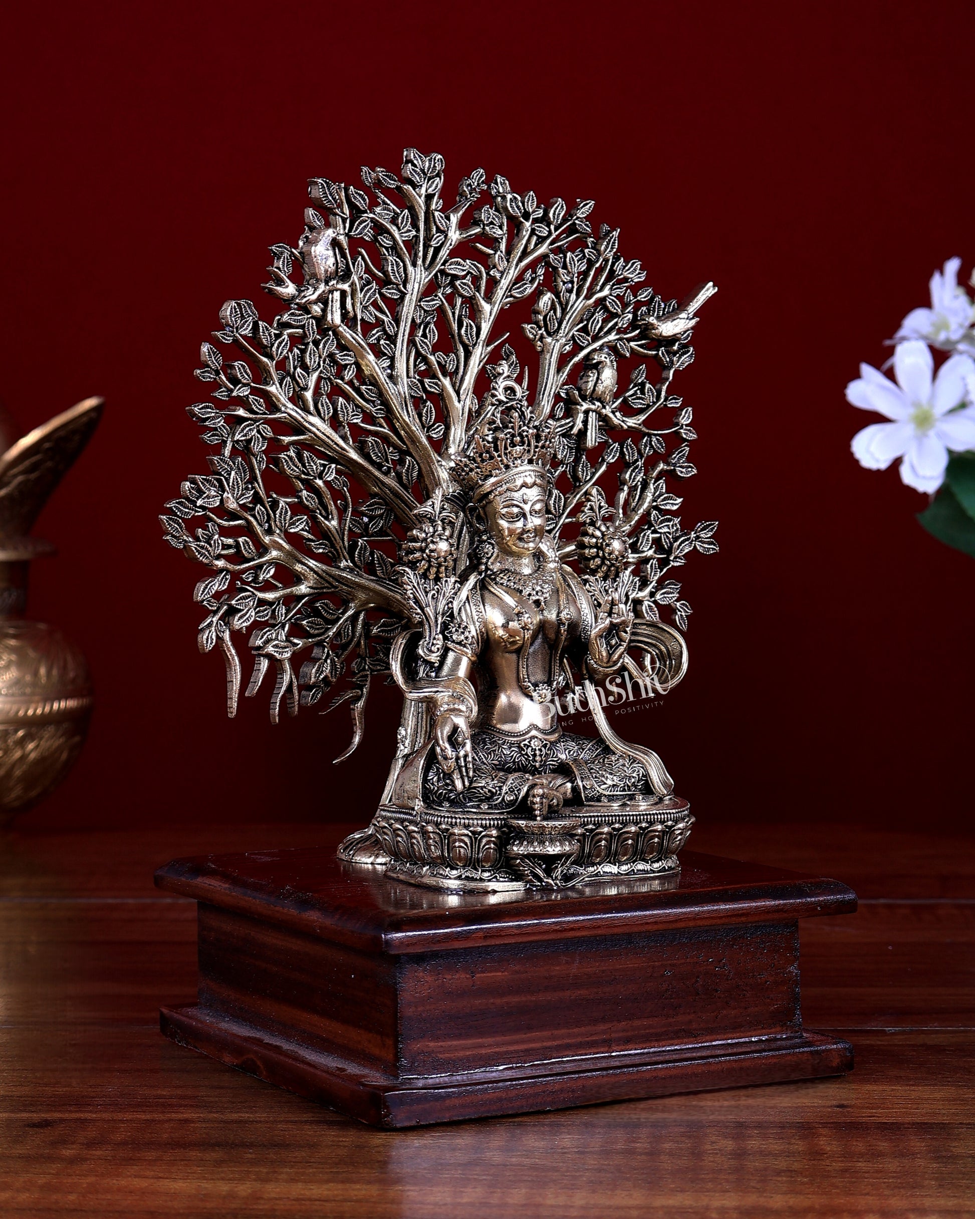 This Brass Superfine Green Tara Idol with Bodhi Tree, set on an elegant wooden base, is a refined representation of Green Tara, the Buddhist deity of compassion, protection, and swift enlightenment. The Bodhi tree backdrop symbolises awakening and wisdom, while the wooden base adds warmth and stability, making this piece ideal as a premium gift or decorative spiritual accent.