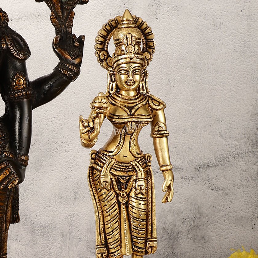 Adorn your sacred space with our Brass Superfine Handcrafted Idols of Lord Venkateshwara, Bhudevi, and Sridevi. Antique Black and Gold Lord Venkateshwara (Balaji) stands 18" tall (Width: 9", Depth: 4"), while Bhudevi and Sridevi each stand 13" tall (Width: 4.5", Depth: 4.5"). Combined weight of 14.6 kgs. These intricately crafted statues showcase exquisite perfection and attention to detail, making them a divine addition to your home or temple, radiating divine energy and grace.