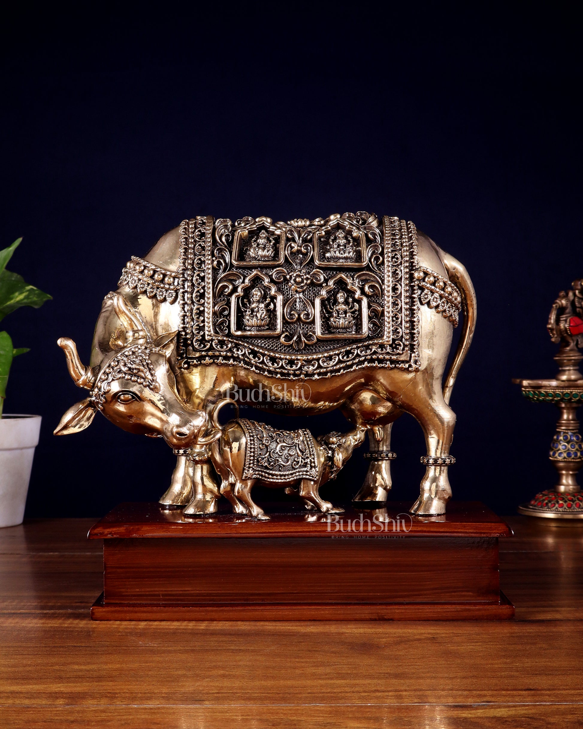 Brass Superfine Kamdhenu Cow with Calf with ashtalakshmi carvings on Wooden Base – 9.5 Inch