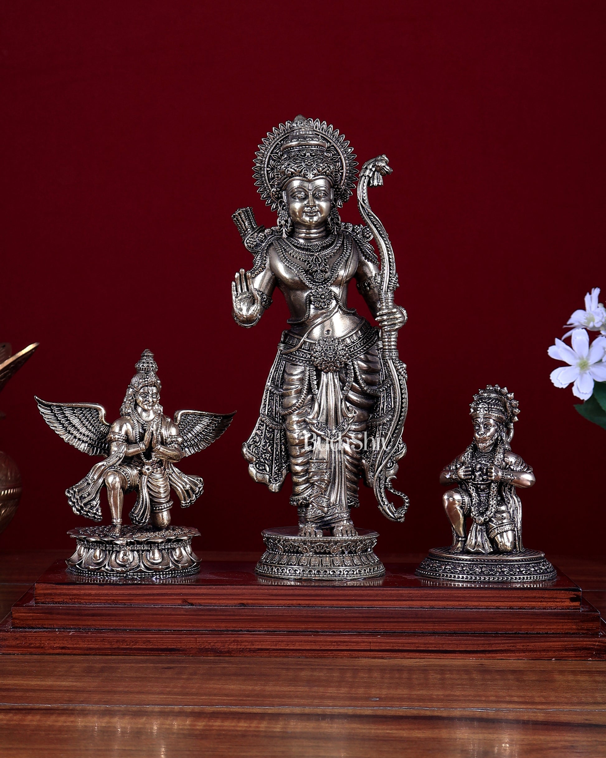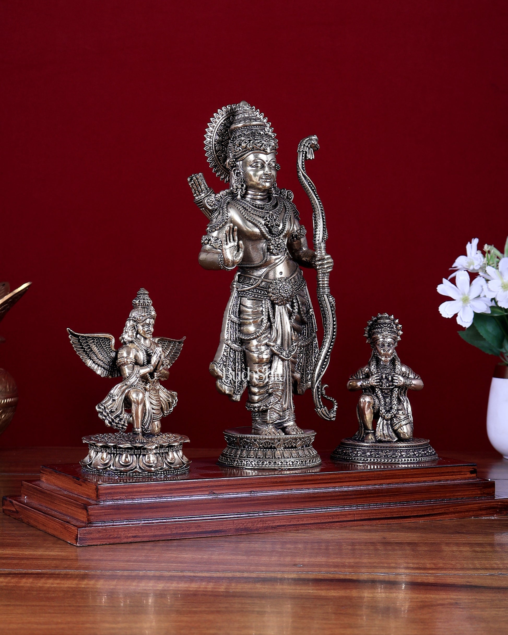 This Brass Superfine Lord Rama statue, accompanied by Garuda and Hanuman, is beautifully set on a solid wooden base, symbolising dharma, devotion, protection, and unwavering strength. The presence of Hanuman reflects supreme bhakti and courage, while Garuda signifies divine power and protection, making this a deeply meaningful and auspicious devotional composition.