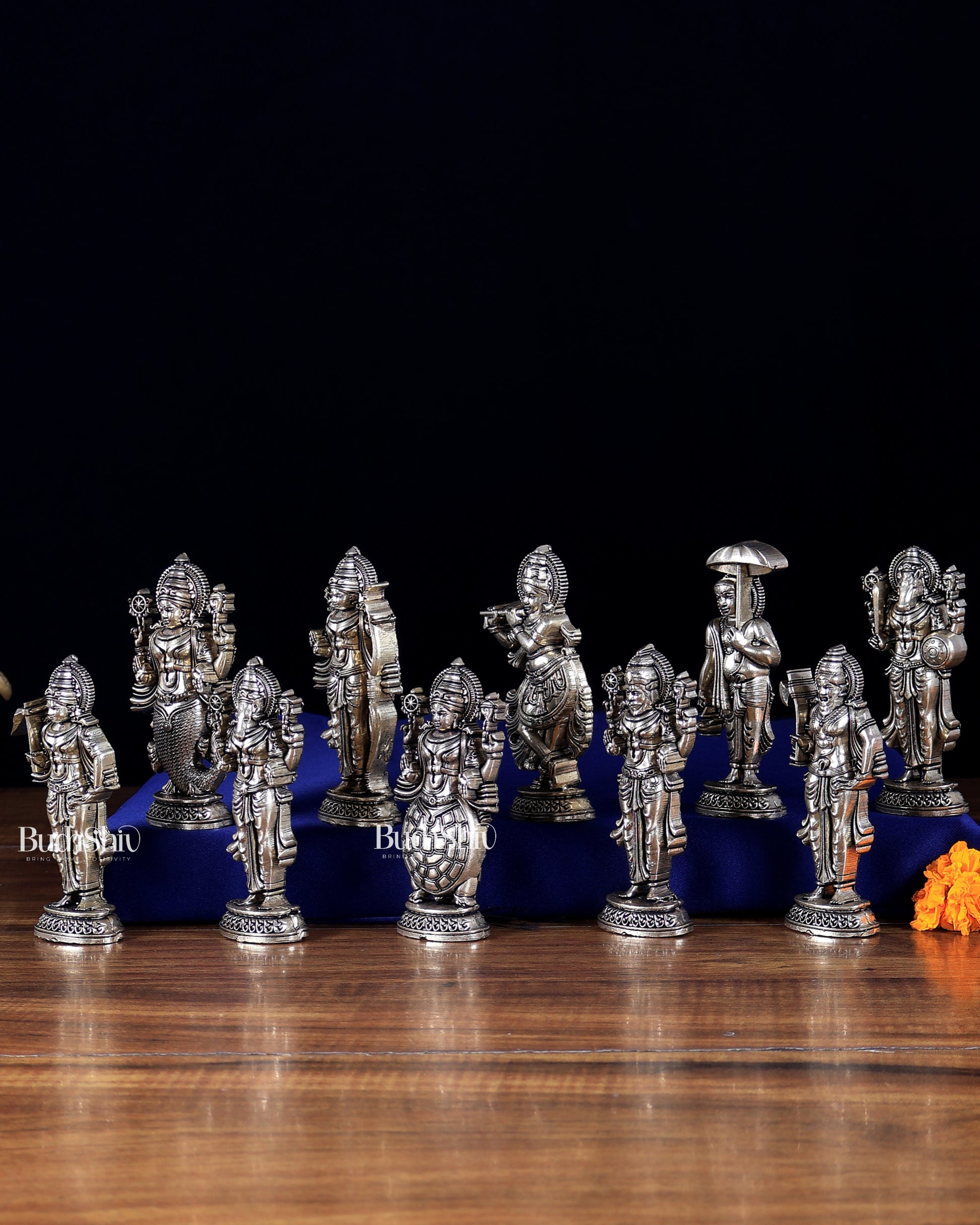 This Brass Superfine Vishnu Dashavatar Idol Set features the ten divine incarnations (Dashavatar) of Lord Vishnu, representing the eternal cycle of creation, preservation, and cosmic balance. Designed in a refined 2D format, this set beautifully presents all avatars in a compact, elegant form ideal for wall mounting or altar placement.