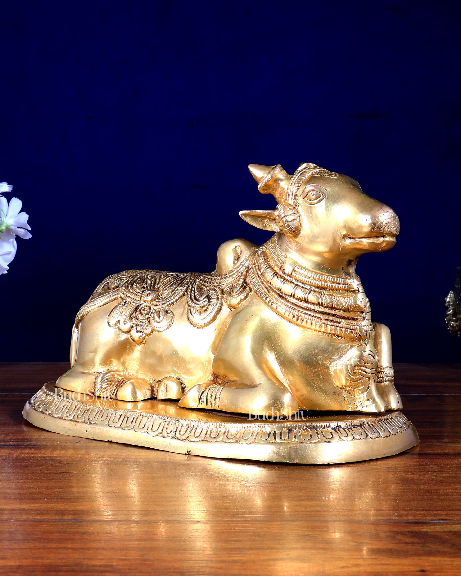 Premium brass Nandi statue with dimensions 11.5" × 7.5" × 5" (29.21 × 19.05 × 12.7 cm). Superfine finish, 5 kg. Ideal for home temple and décor.