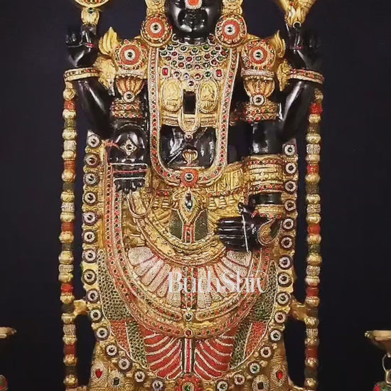 Bring home the divine presence of Lord Venkateshwara with our exquisite Tirupati Balaji idol in black tone. Crafted from superfine brass and adorned with outstanding diamond like jewellery studded work, this majestic piece stands tall at 48 inches in height, with dimensions of 21 inches in width and 8.5 inches in depth. The rose golden finish adds to its elegance and charm. Weighing 49 kgs.