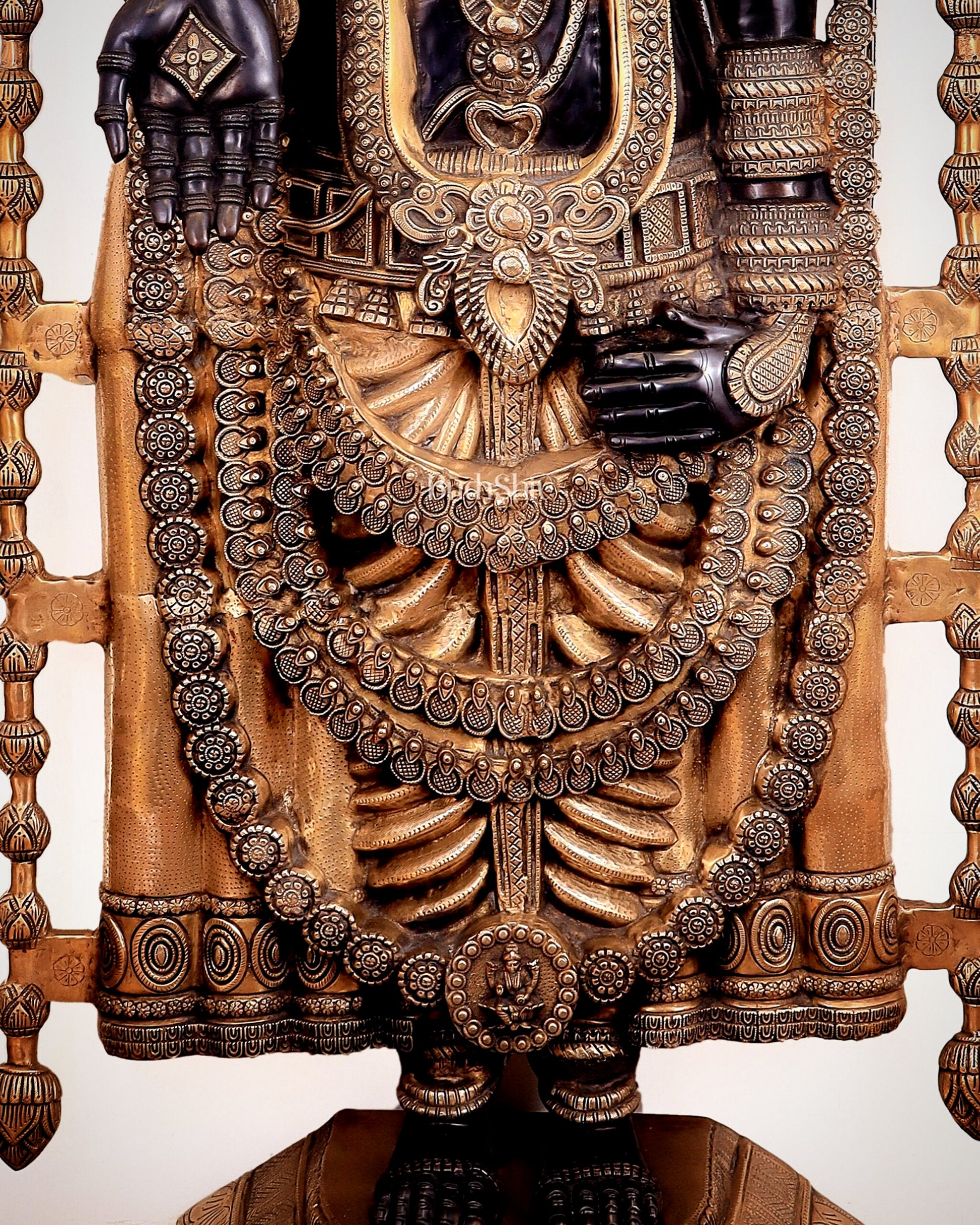 6 feet tall Black Brass Tirupati Balaji statue. Crafted with precision, it stands at a majestic height of 69 inches, with a width of 19 inches and depth of 9.5 inches. Weight 115 kgs.