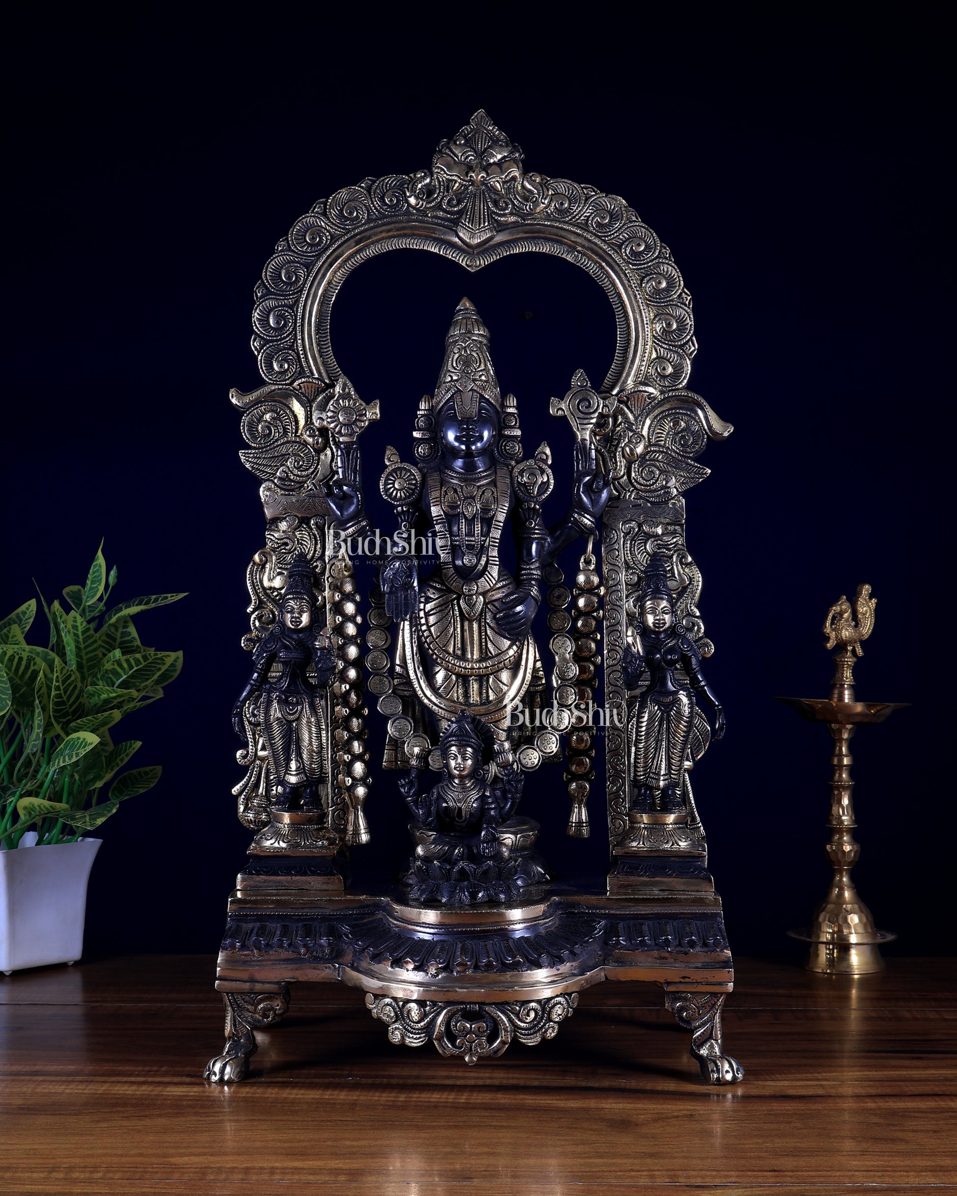 A magnificent pure brass Tirupati Balaji ensemble featuring Balaji with Bhudevi, Sridevi, and Padmavathi, adorned with an exceptionally detailed Prabhavali showcasing Hanuman, Garuda, and a majestic Kirtimukha at the top.