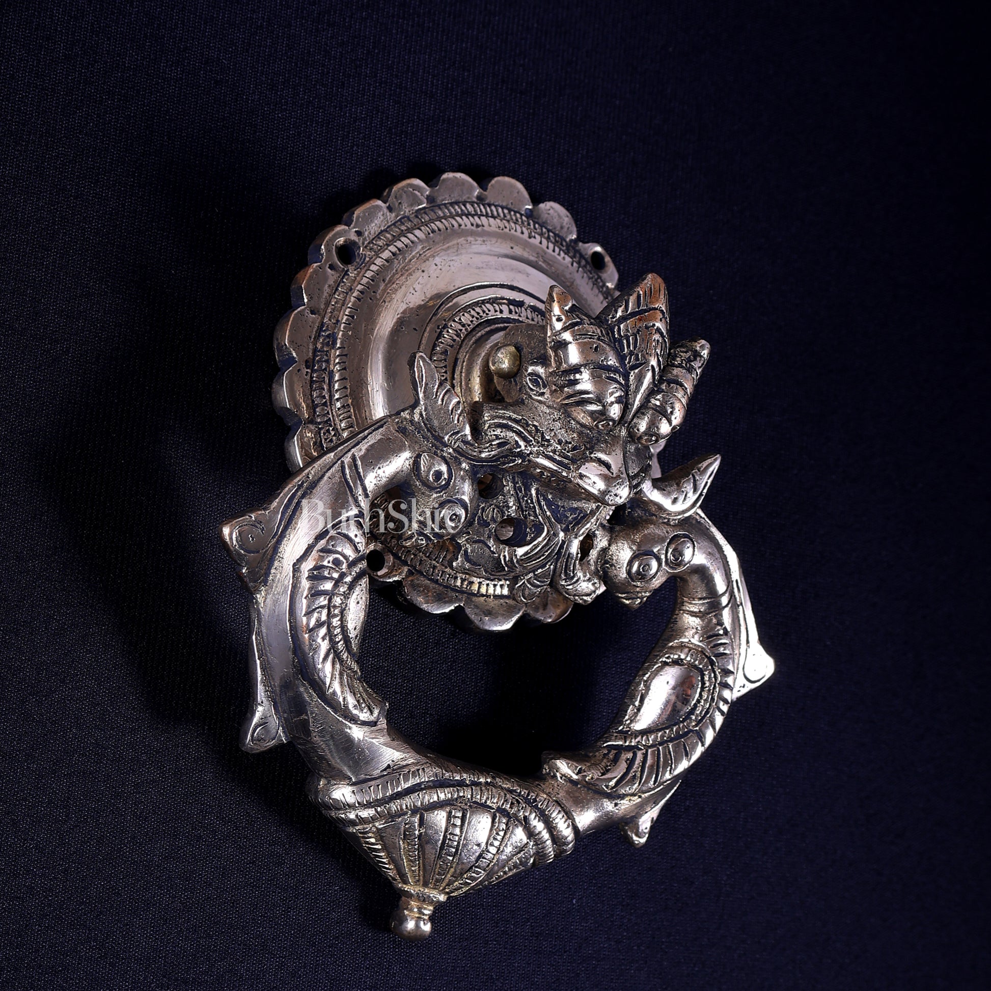 Brass Yali Design Door Knocker. Inspired by ancient South Indian temple architecture, the mythical Yali symbolizes protection, strength, and prosperity—making it a perfect choice for your main door décor.