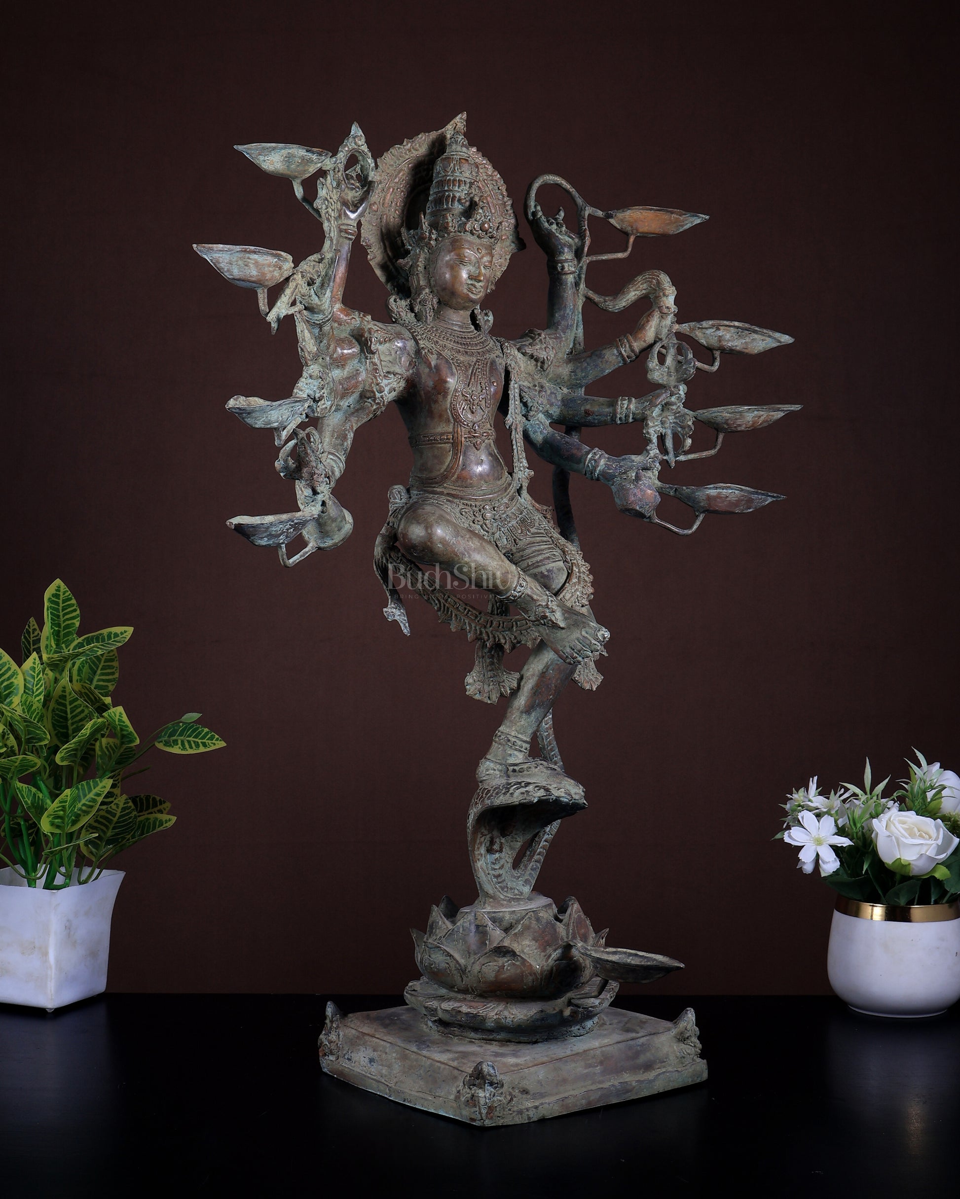 Bronze Kalinga Daman Narthana Krishna Sculpture with eight arms holding diyas, crafted using the lost wax technique Vintage green Patina. This striking piece measures 26" (Height) x 20" (Width) x 7" (Depth), symbolizing divine grace and intricate artistry.