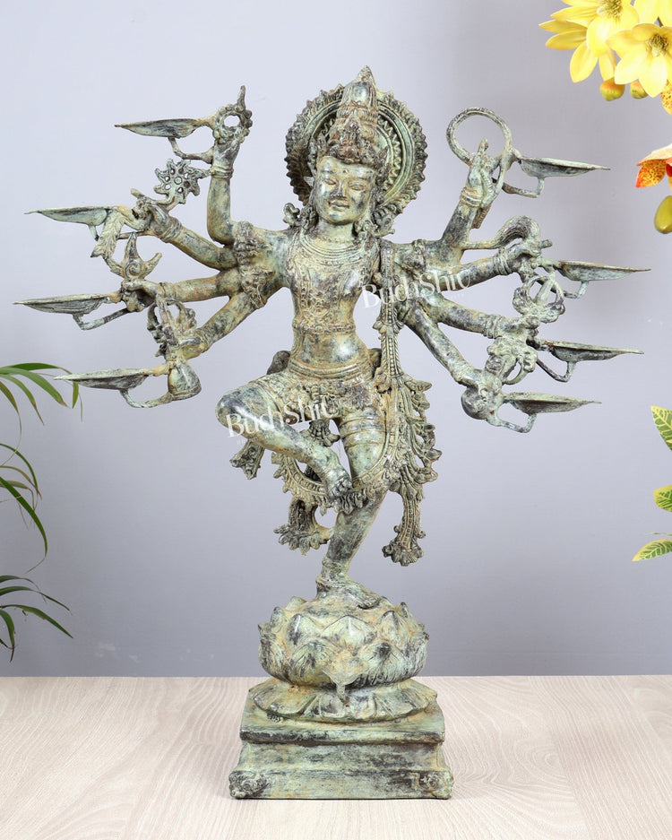 Crafted using traditional lost wax casting techniques, the artefact showcases intricate detailing, balanced composition, and an antique bronze finish that enhances its timeless appeal. Ideal as a statement spiritual décor piece, this sculpture radiates elegance, movement, and sacred energy.