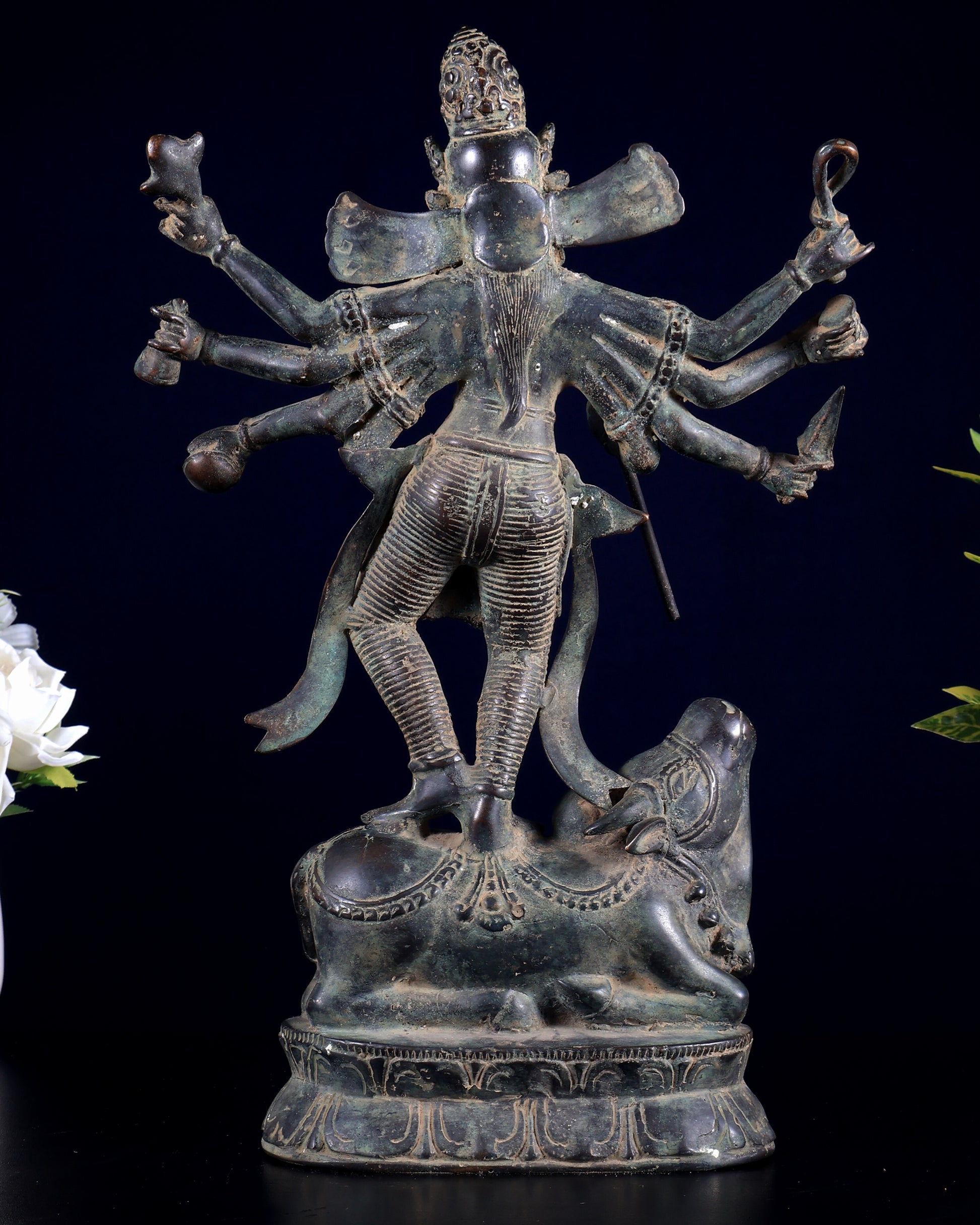 Indonesian Bronze Goddess Durga Statue, crafted using the lost wax casting technique. Measuring 13 inches in height, 9 inches in width, and 4 inches in depth, this 1.5 kg masterpiece showcases the fierce and protective spirit of Durga. Perfect for spiritual and artistic collections.