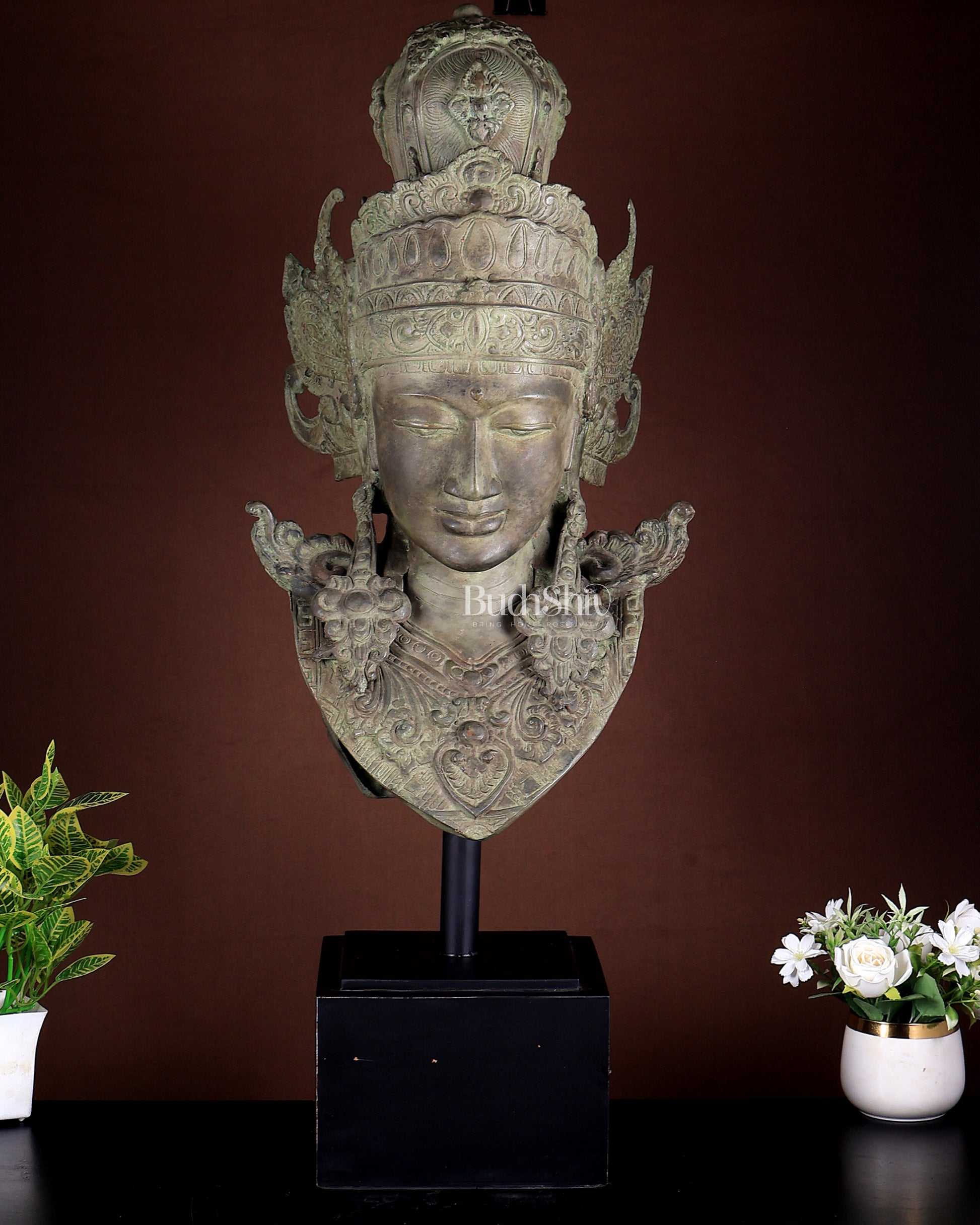 Bronze Goddess Lakshmi Face Bust With Garuda on Wooden Base | Indonesian Art Sculpture 36 Inch