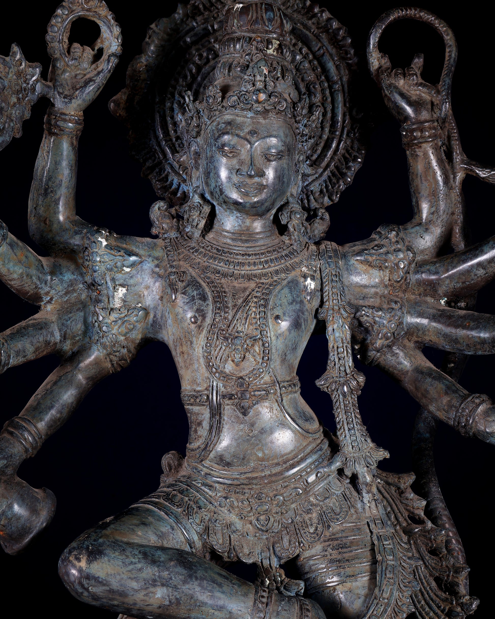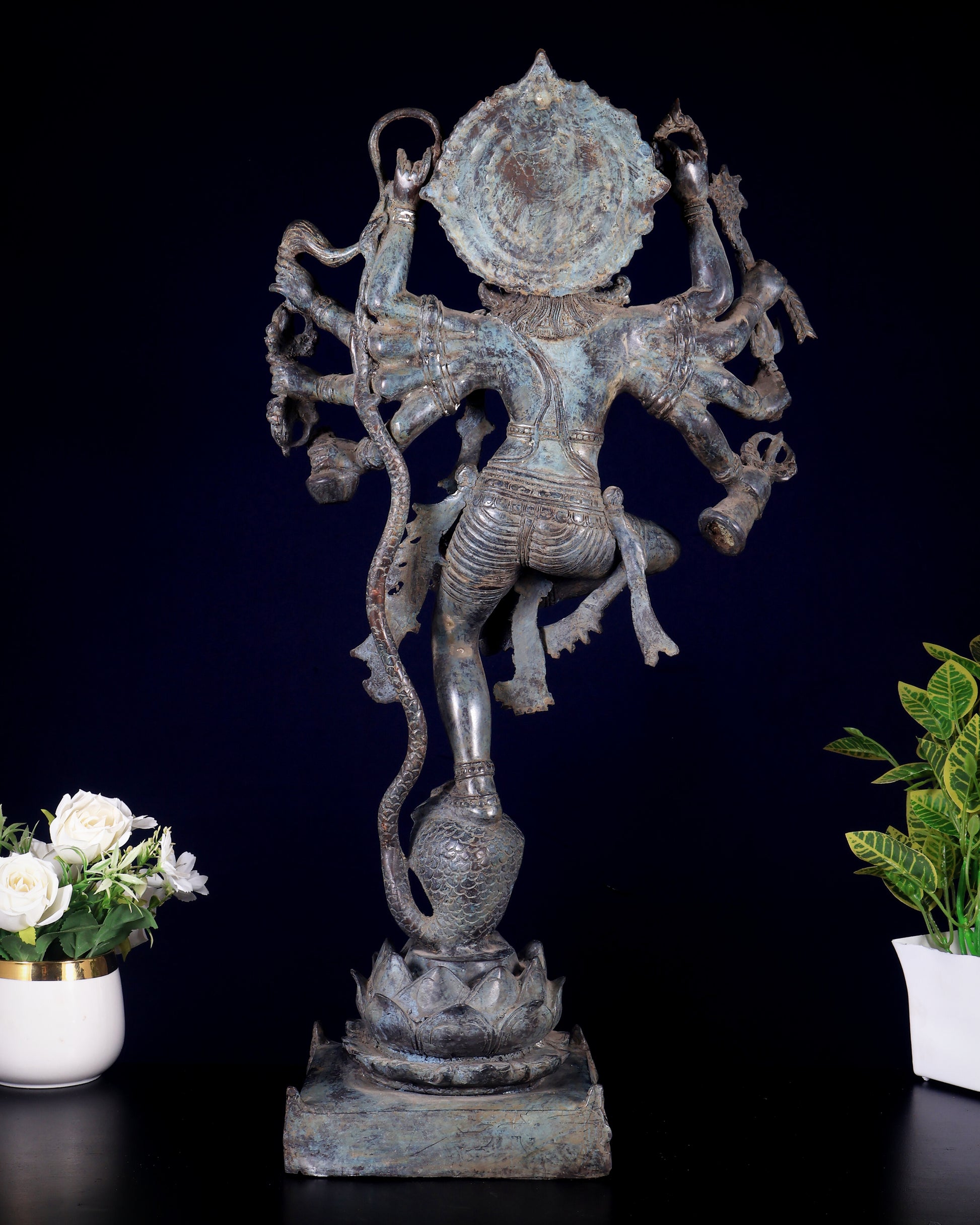 Balinese Bronze Dancing Krishna on Kaliya Naag Sculpture, standing 25" tall with a Width of 24 inch and 7" base. This exquisite piece, weighing 7 kgs, showcases intricate artistry and divine grace, perfect for adding a spiritual touch to any space.