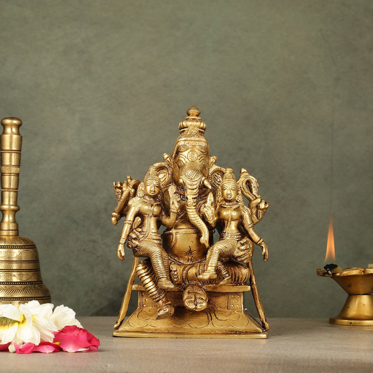 Bring home the blessings of Lord Ganesha with this exquisite pure brass statue featuring Riddhi and Siddhi. Measuring 7 inches in height, 5 inches in width, and 3.50 inches in depth, this divine piece weighs approximately 2.50 kg, radiating spirituality and prosperity to your space.