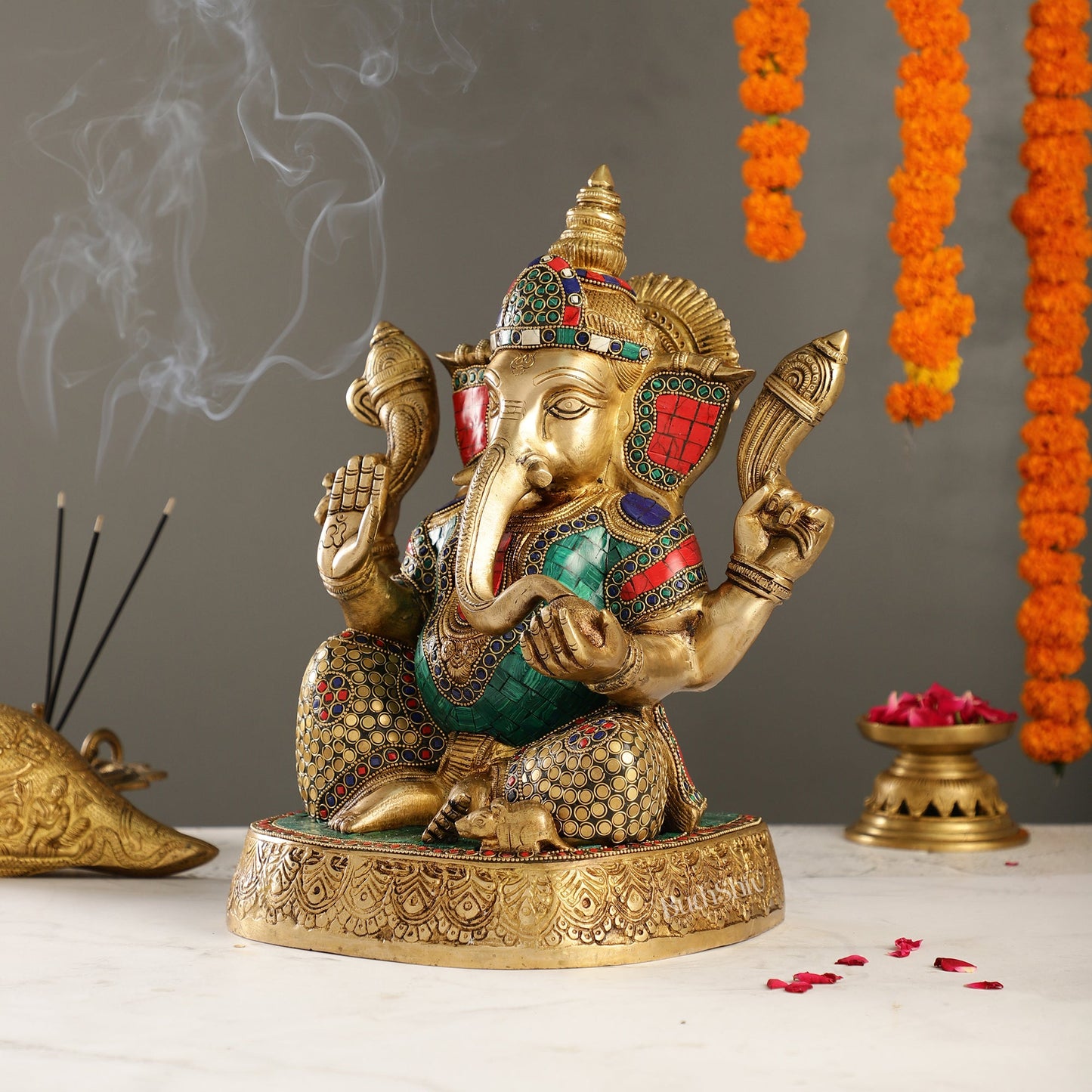 Brass Handcrafted Lord Ganesha Statue with Stonework | 15" Height