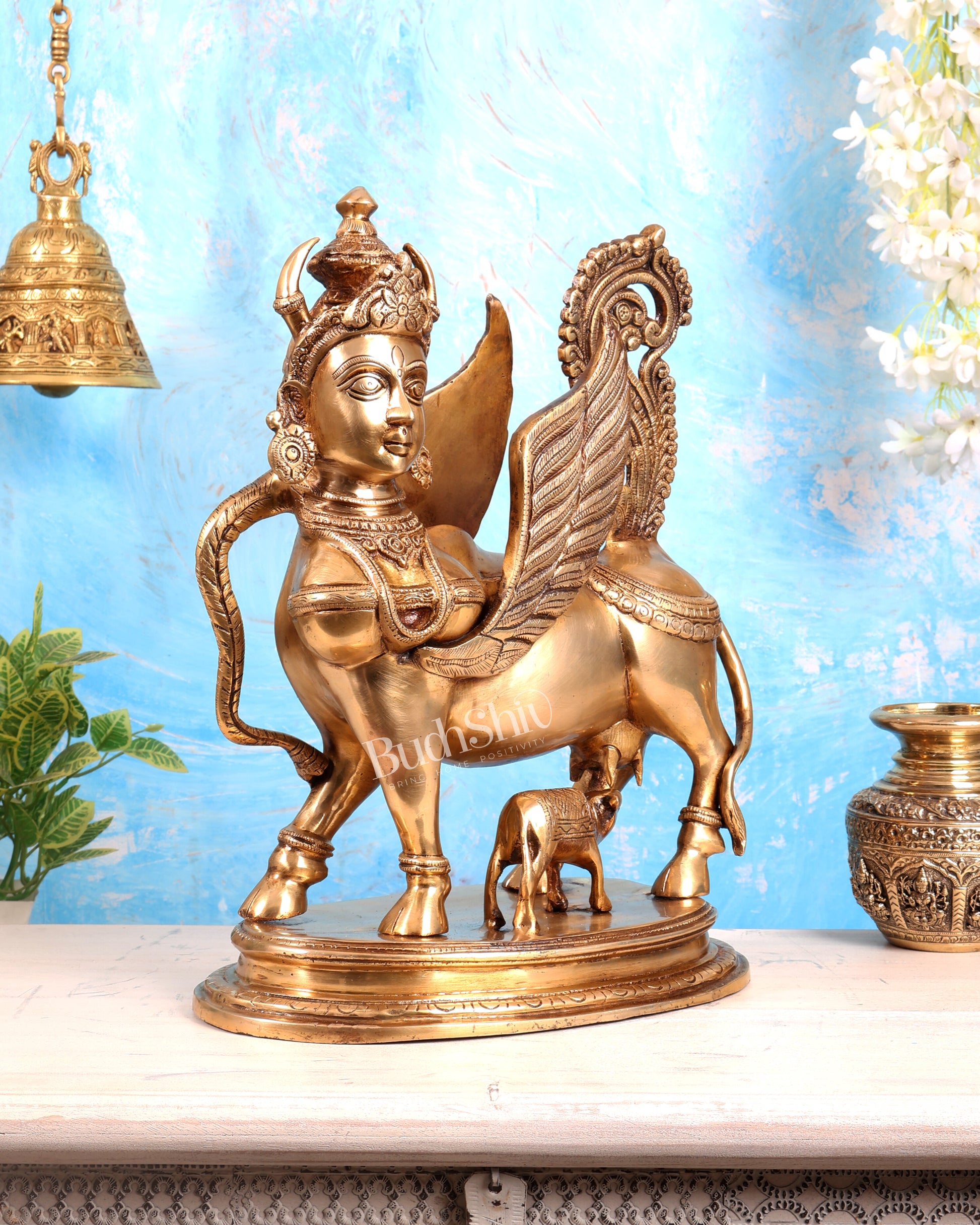 Brass Kamdhenu Cow Statue with wings and Goddess face with calf, standing at 16.5 inch tall, 19.5 inch wide, and 7.5 inch deep. Meticulously crafted from high-quality brass this statue beautifully captures the grace of the divine bovine goddess. Weight 14 kgs