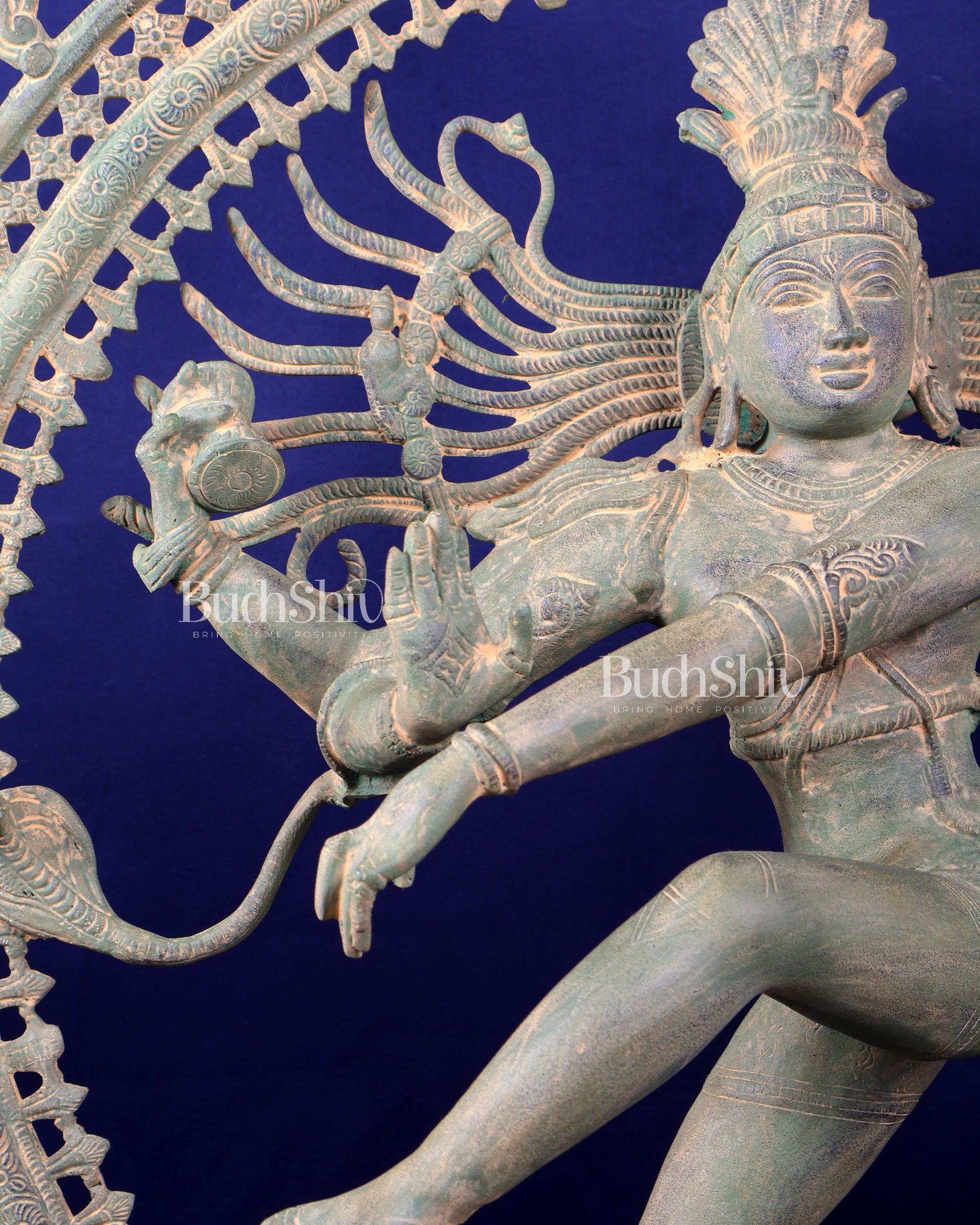 Large handcrafted superfine brass Nataraja statue by BudhShiv. Finished in a timeless Green Sand finish. Standing tall at 36 inches with a width of 30.5 inches and a depth of 10 inches, this captivating masterpiece radiates a powerful aura. Weighing 36 kgs, this statue symbolizes strength and spiritual significance, making it a remarkable addition to any sacred space or collection
