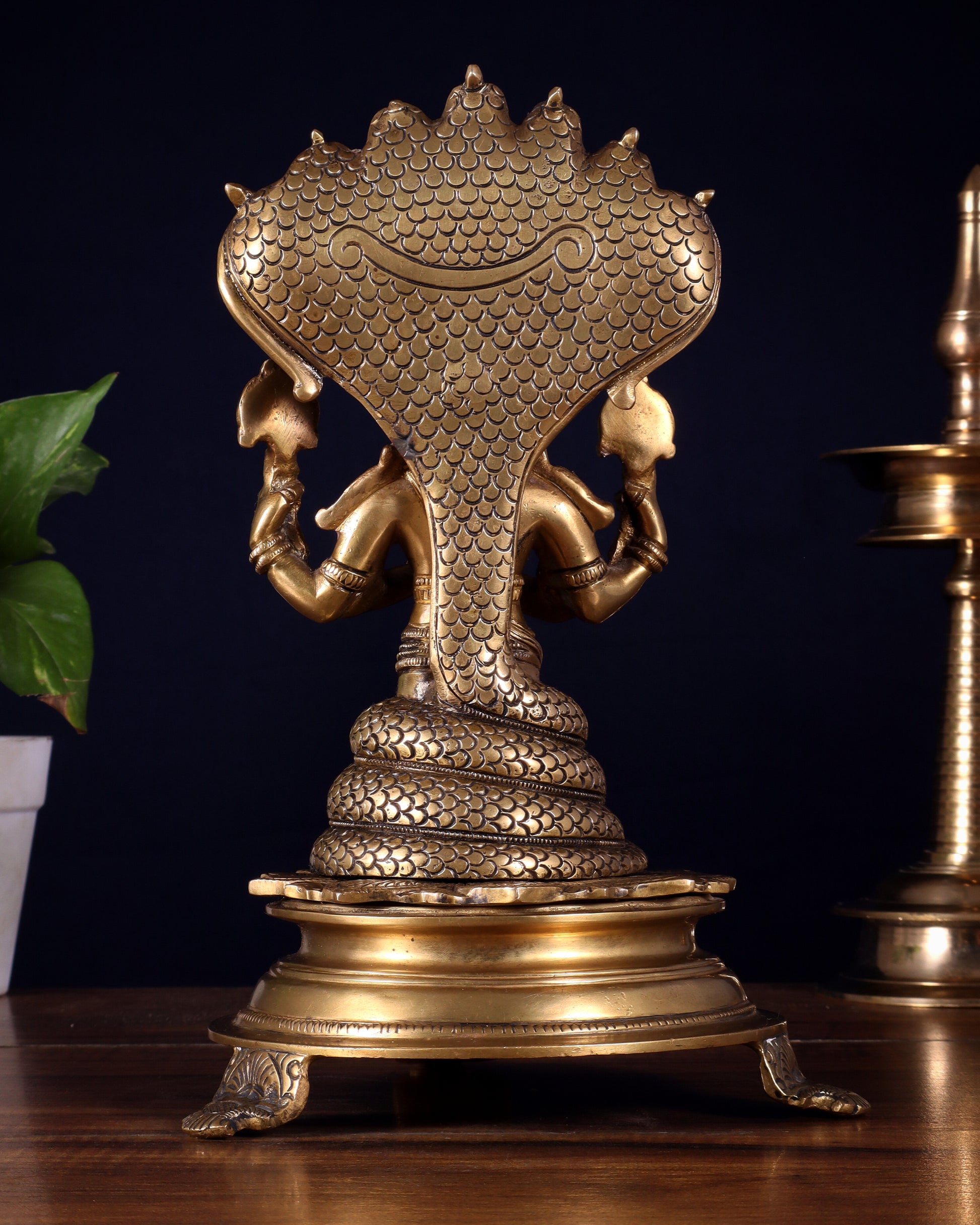 Pure Brass Patanjali dev statue. Embrace the essence of yoga and honor the Father of Yoga, Lord Patanjali. This finely crafted statue showcases the divine presence of Lord Patanjali in his iconic half human and half snake form. With dimensions of 10.5 inches in height, 7 inches in width, and 7 inches in depth, this statue weighs 3.2 kgs.