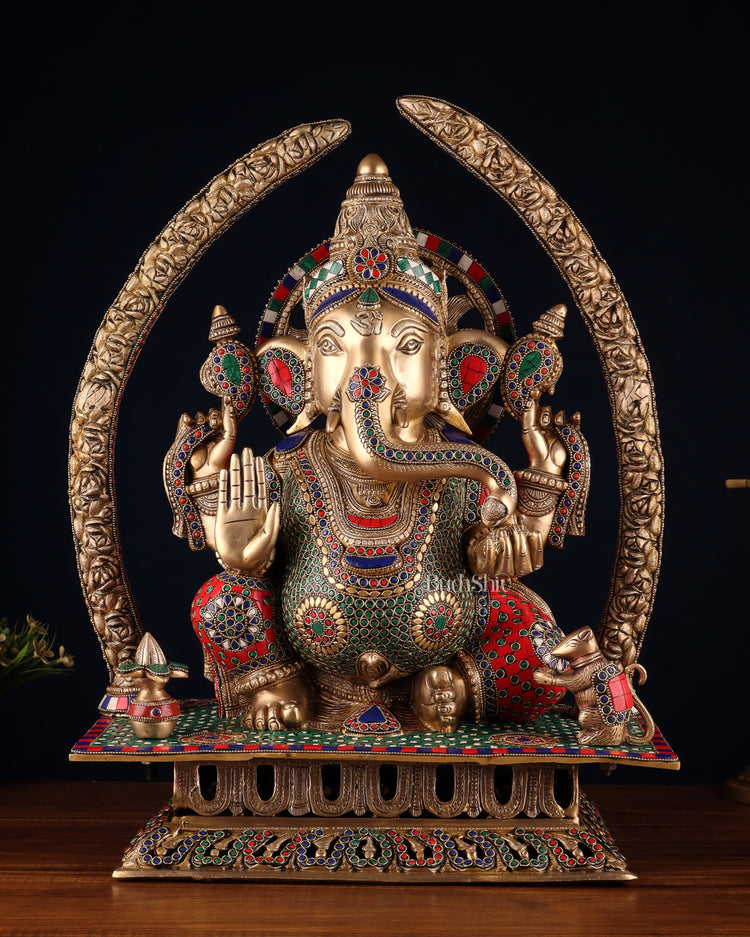 Evoke grace with this 22-inch tall, 17-inch wide, and 11-inch deep handcrafted brass statue of Lord Ganapathi. Seated on a carved base and adorned with elephant tusk-shaped arch pillars, it's a masterpiece of devotion and craftsmanship. Infuse your space with blessings and positive energy. Weight 25 kgs.