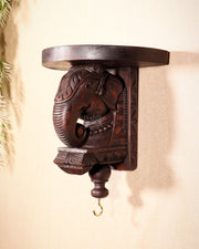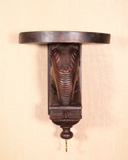 Add ethnic elegance to your home with this beautifully carved wooden elephant wall hanging bracket, complete with a functional shelf and a sturdy brass hook. This multi-utility piece blends aesthetic charm with practical use—perfect for hanging bells, diyas, or décor elements.