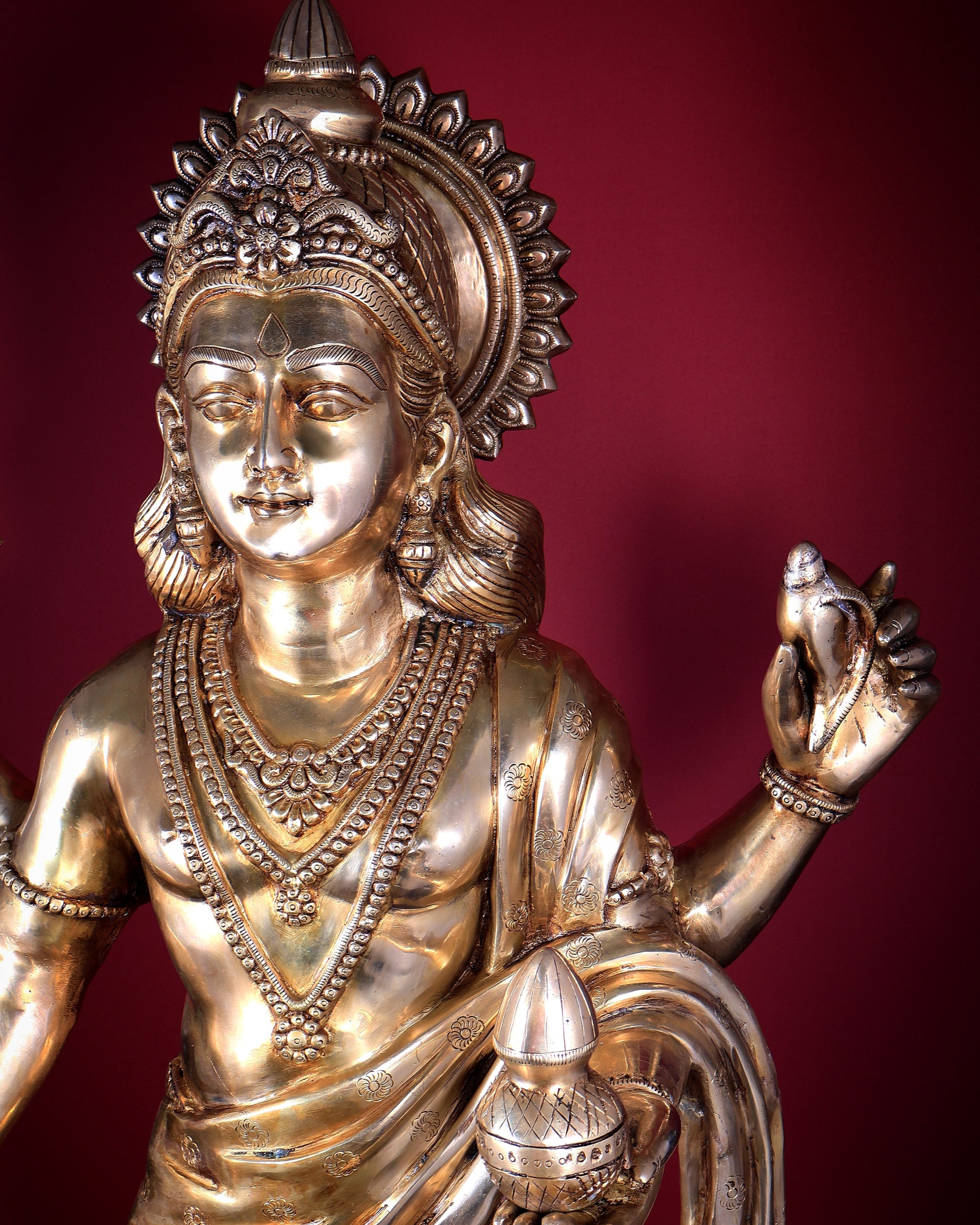 Bring divine healing energy into your space with this large pure brass Dhanvantari statue, the Hindu god of Ayurveda and medicine. Standing 50 inches (127 cm) tall, with a width of 23 inches (58.4 cm) and depth of 14 inches (35.6 cm), this magnificent handcrafted sculpture weighs approximately 60 kg. Ideal for temples, hospitals, wellness centers, ayurvedic clinics, and spiritual installations, this grand idol symbolizes health, longevity, and divine healing power.