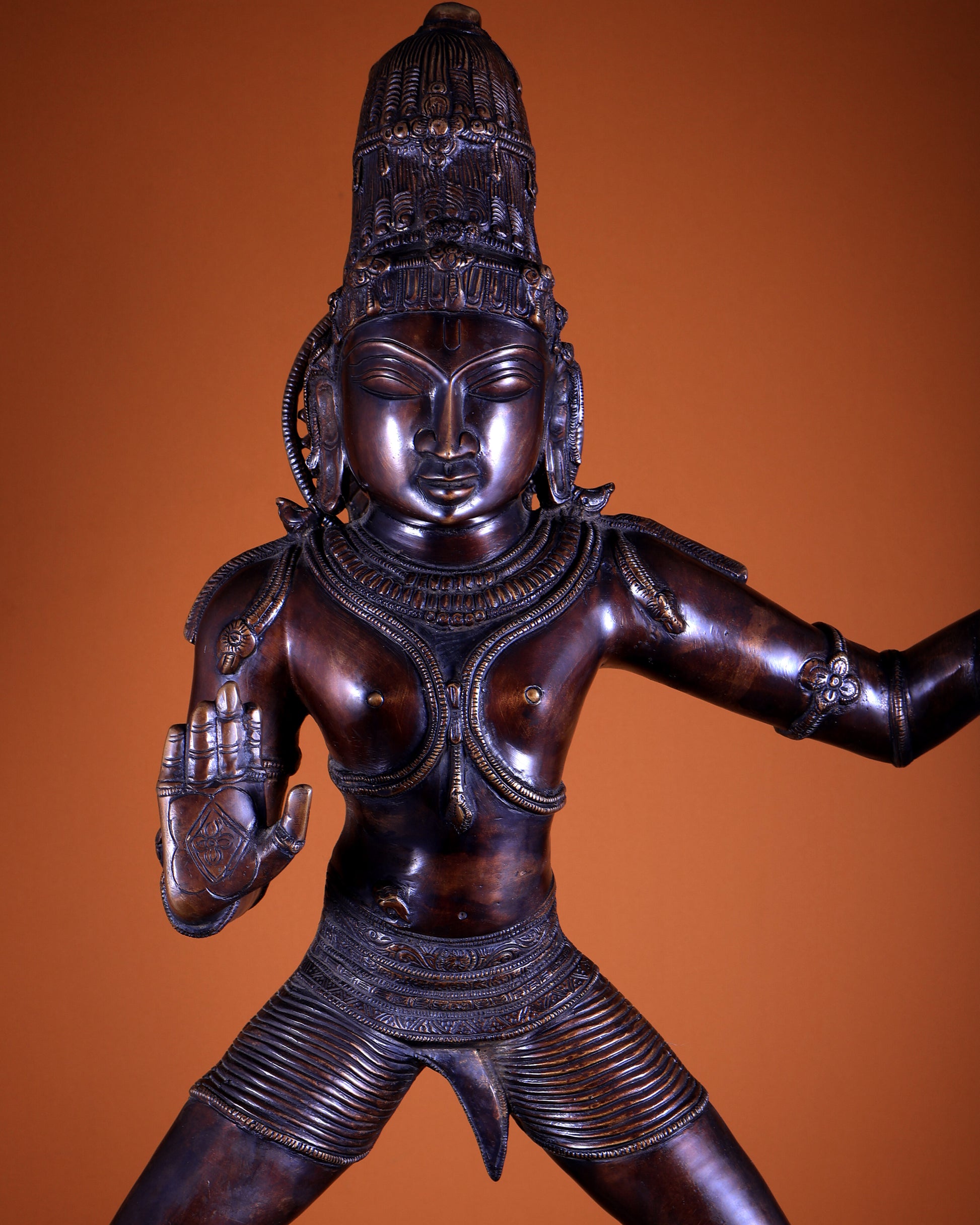 Majestic large brass statue of Lord Krishna dancing on Kaliya Naag, finished in antique bronze. Dimensions: 42” x 17” x 12” (106.7 cm x 43.2 cm x 30.5 cm). Weighs 28 kg. A powerful and divine statement piece for temples or grand spaces.