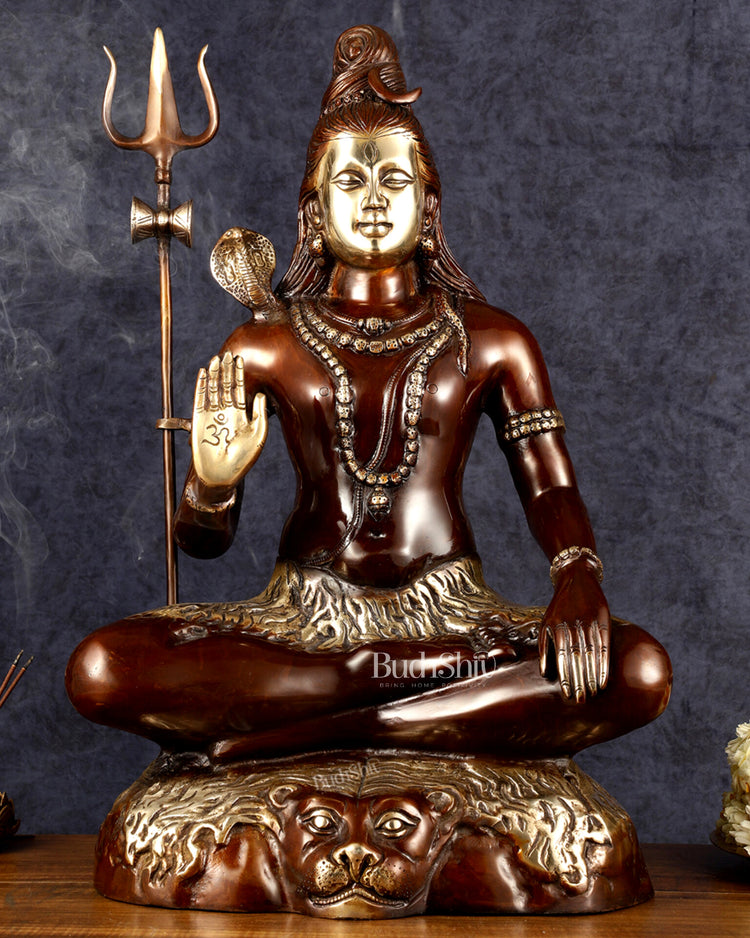Invite the divine presence of Lord Shiva, Mahadev, into your space with our exquisite brass idol. Handcrafted in India from superfine brass, this statue depicts Bholenath in a meditative blessing posture, seated on a tiger throne with snakes adorning his body. The trident (trishul) by his side adds to the sacred symbolism. With dimensions of Height 24 inches, Width 14.5 inches, and Depth 10 inches, and weighing 16 kgs