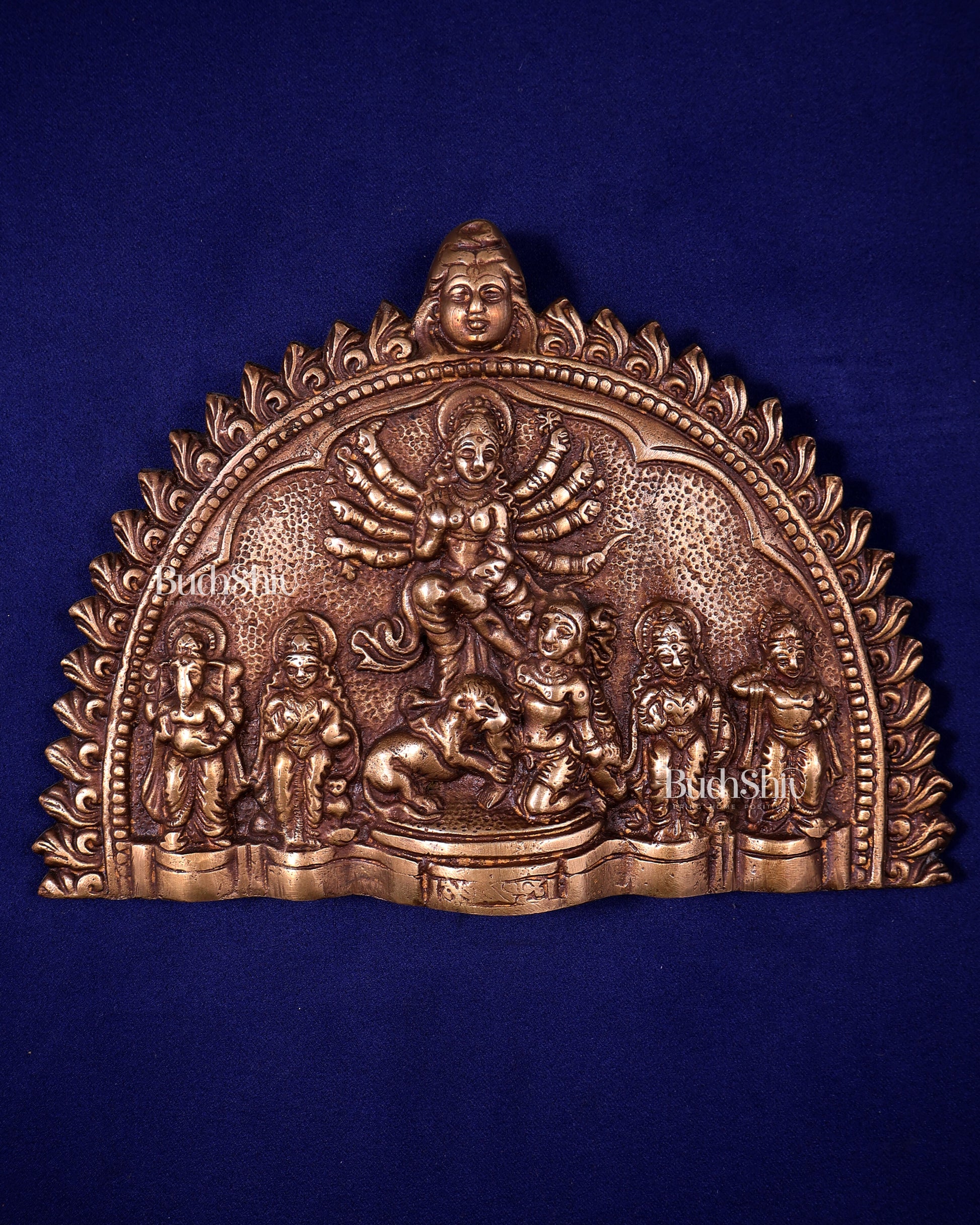 Elevate your space with our meticulously crafted Brass Wall Hanging Plate featuring the divine family of Goddess Durga, Ganesha, Lakshmi, Saraswati, and Karttikeya. With a height of 7 inches and a width of 9.5 inches, this piece exudes artistic charm and spiritual significance. Weighing 1.46 kg.