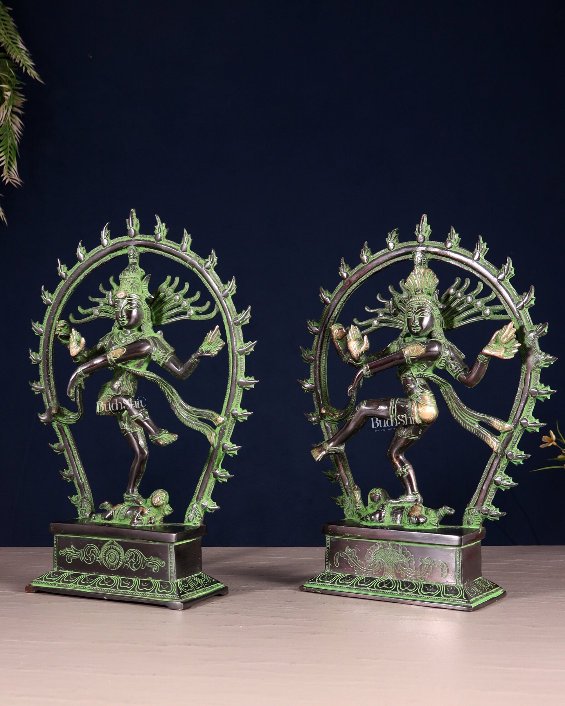 Pair of Brass Nataraja Statues – Black & Green Patina Tone (Mirror Image Set) 12"