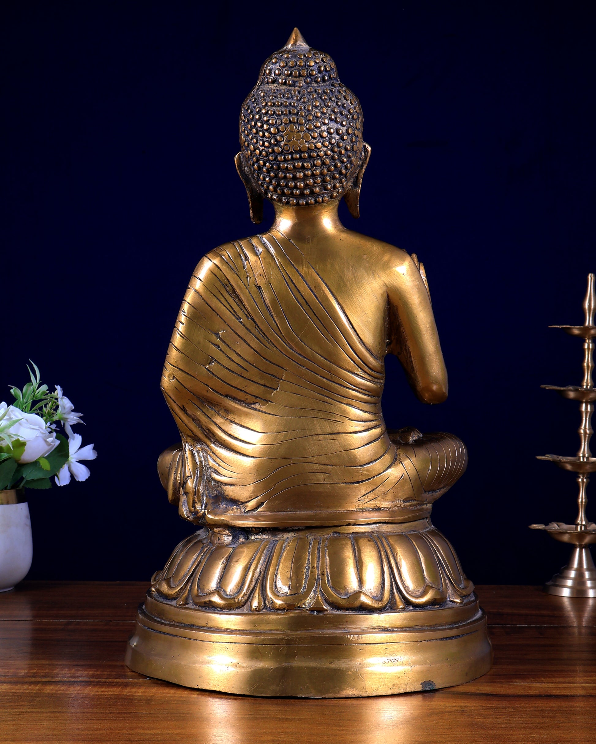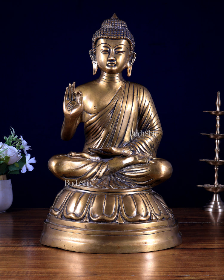 Discover tranquility with our Pure Brass Blessing Buddha statue, uniquely crafted to inspire peace and positivity. Measuring 16 inches in height, 9 inches in width and depth, and weighing 6.5 kg, this exquisite piece is perfect for enhancing your home or meditation space.