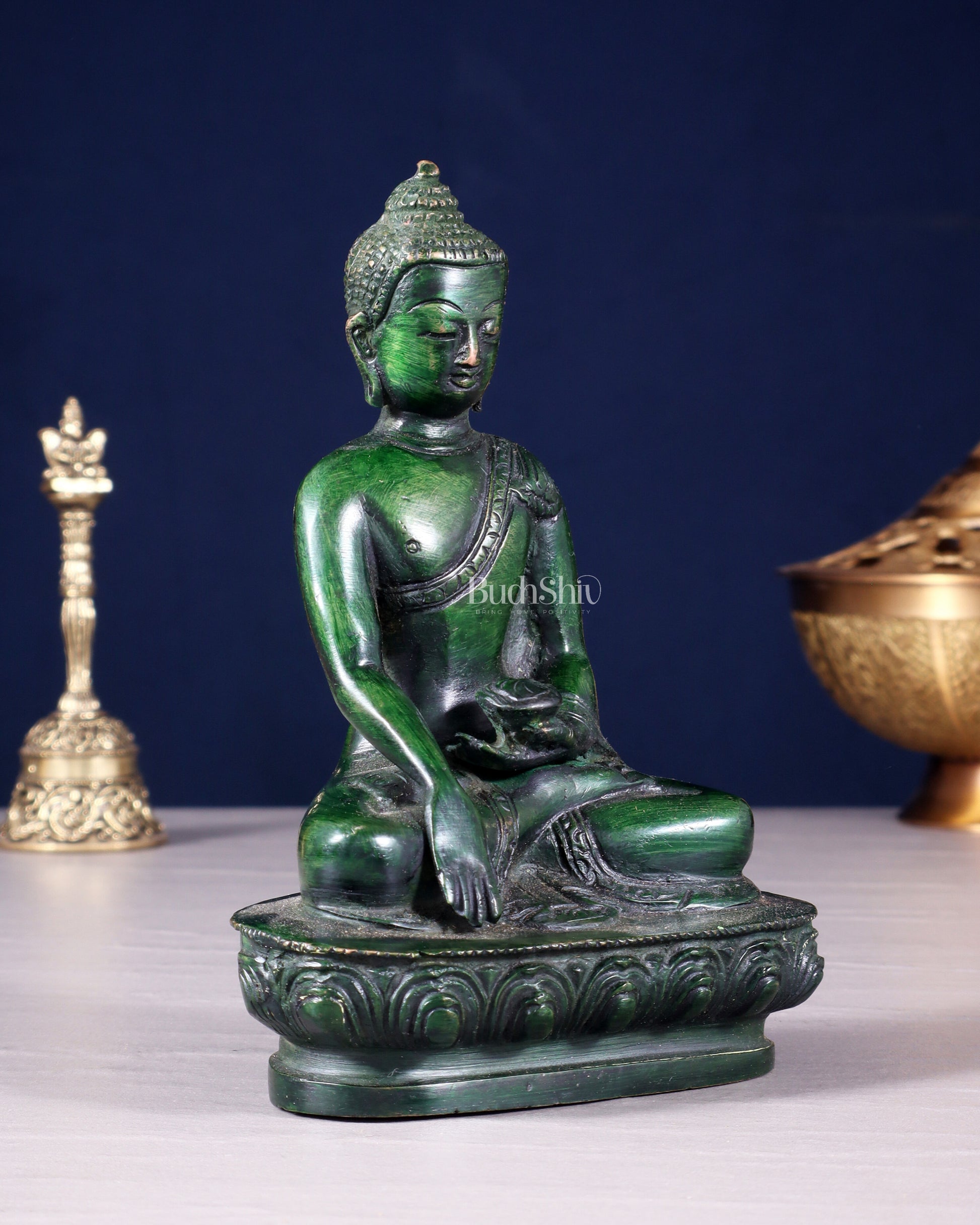 Pure Brass Buddha Bhumisparsha Nirvana Mudra Idol in Nepalese agate green stone finish.