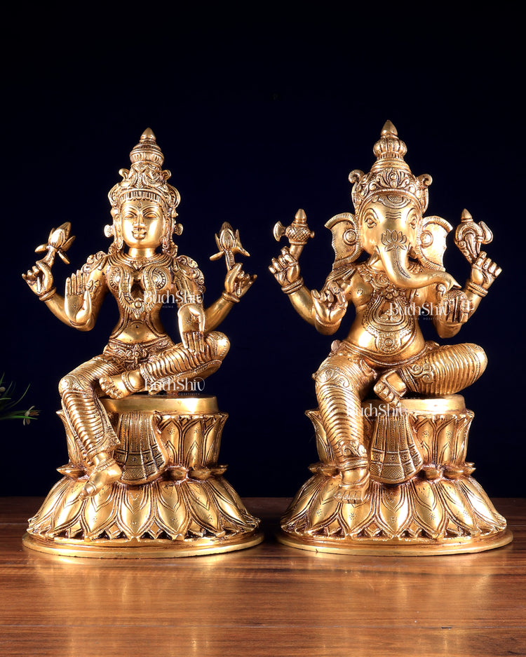 Pure Brass Ganesh Lakshmi on Lotus Idols – Divine Prosperity Duo for Home Temple 15 inch
