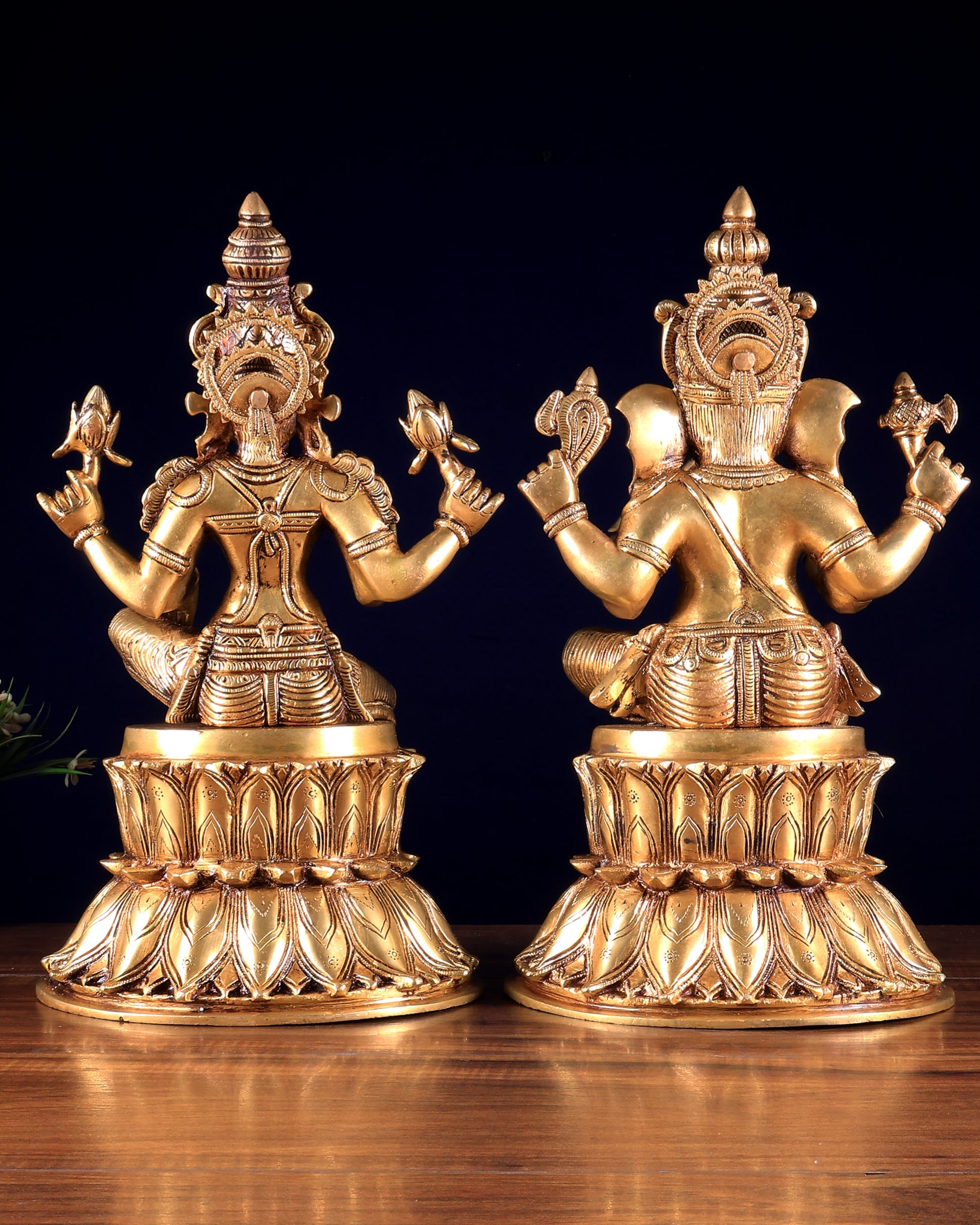 This exquisite pair of Pure Brass Ganesh and Lakshmi idols, masterfully handcrafted with detailed carving and polished to perfection. Lord Ganesha, the remover of obstacles, and Goddess Lakshmi, the bestower of wealth and prosperity, together bring balance, fortune, and success to your space.