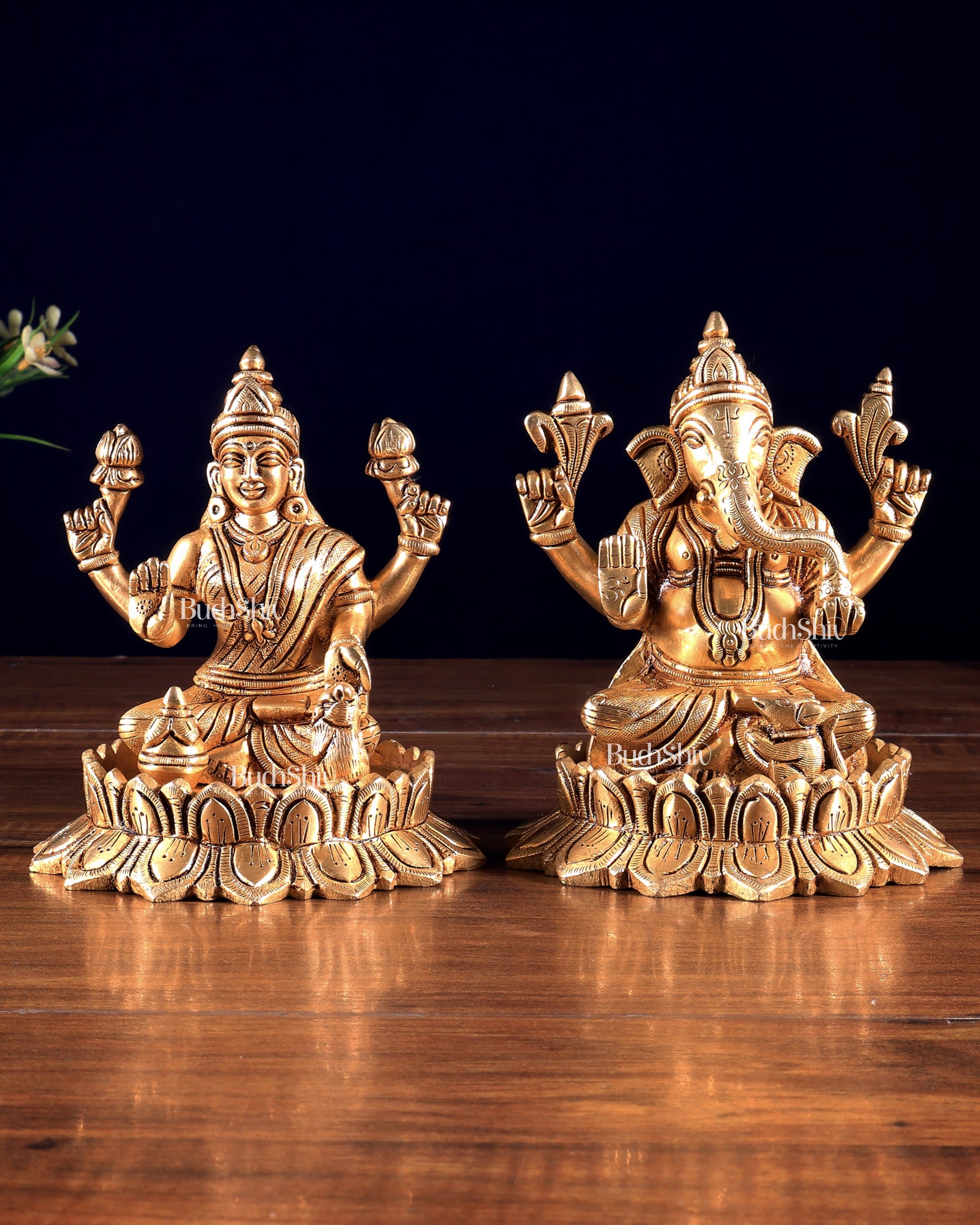 Pure Brass Ganesh Lakshmi on Lotus Idols – Divine Prosperity Duo for Pooja Rooms 6 inch