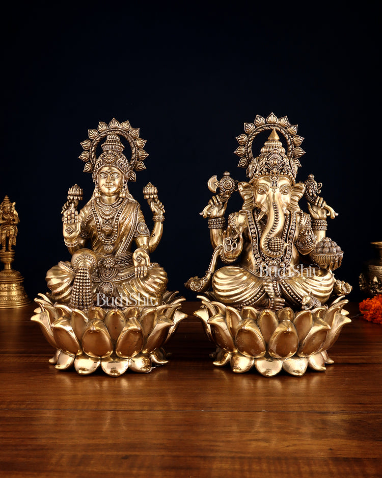 Pure Brass Ganesha & Lakshmi on Lotus – Padmasan Mudra Idol Pair 6 inch