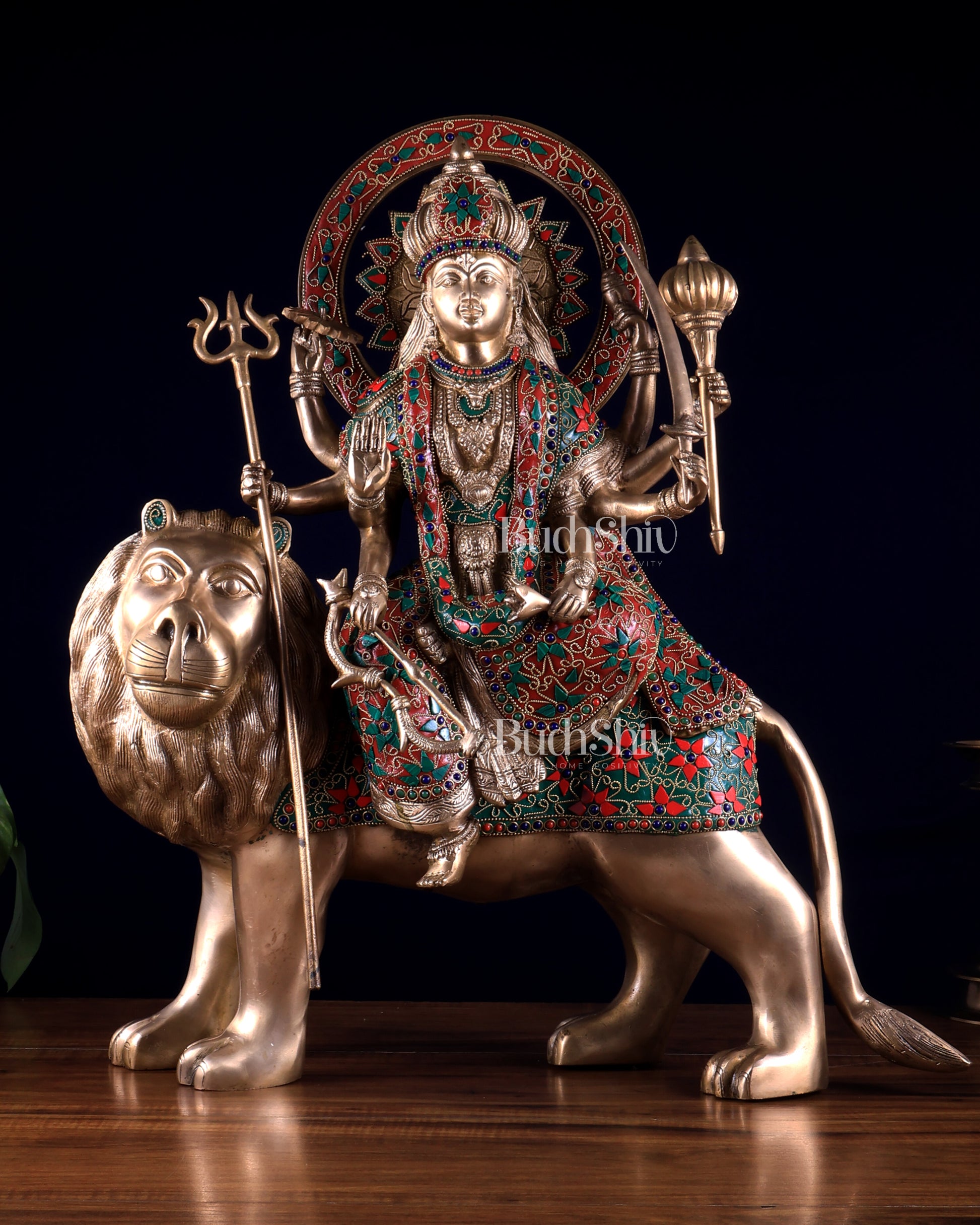 Pure Brass Goddess Durga statue featuring intricate floral meenakari work. Measuring 22 inches in height, 15 inches in width, and 7 inches in depth, this 19.5 kg masterpiece is perfect for adding elegance and divinity to your decor.
