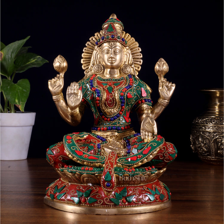 Lakshmi ji is depicted in a graceful seated posture, holding lotus flowers and bestowing blessings (varada mudra), symbolizing abundance, purity, and divine grace. The colorful stone inlay adds vibrance while enhancing the sacred appeal of the piece.