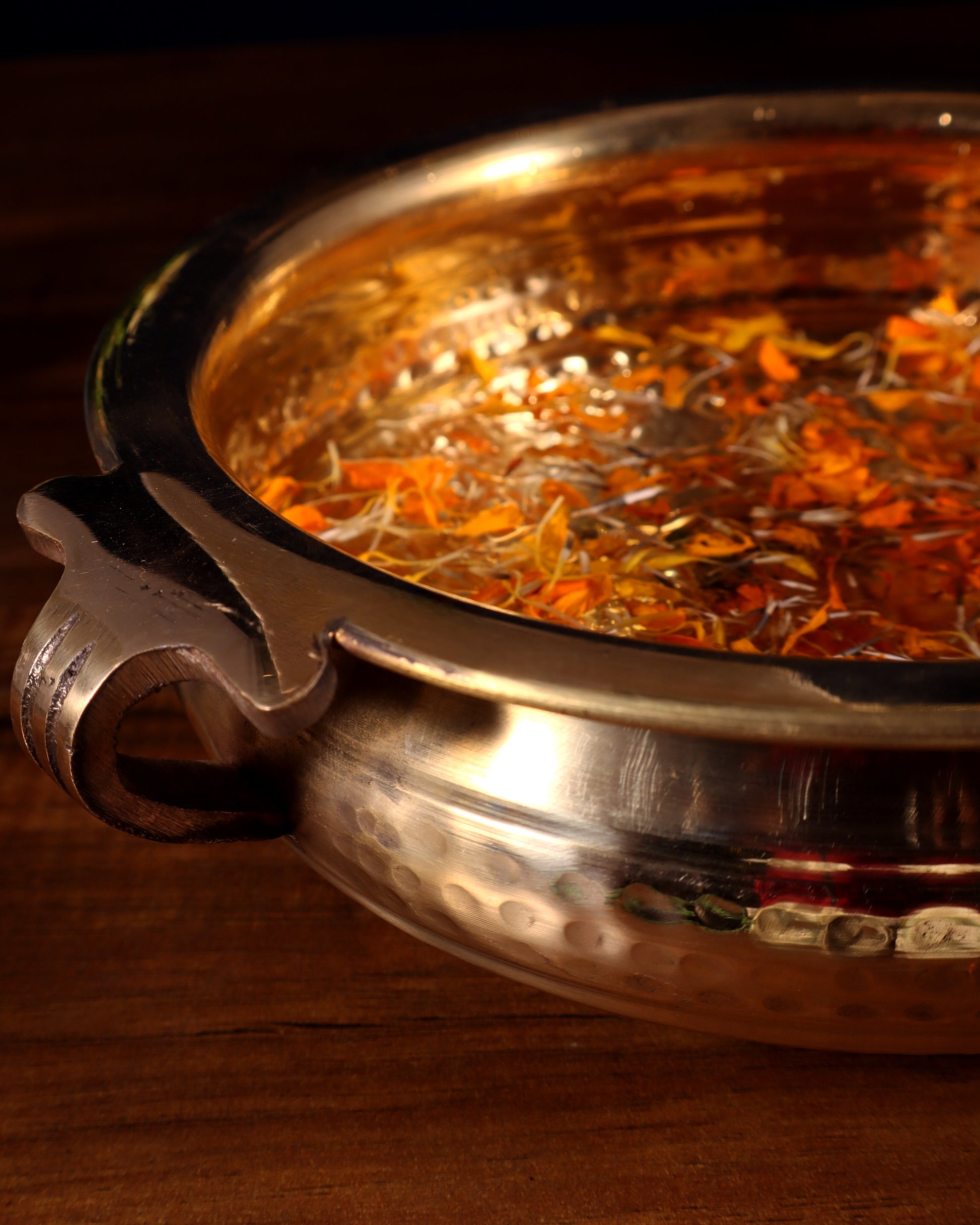 Pure brass handcrafted urli with hammered finish and side handles. Size: 10" W x 3.8" H (25.4 x 9.65 cm). Weight: 770 gm. Ideal for décor & festive settings.