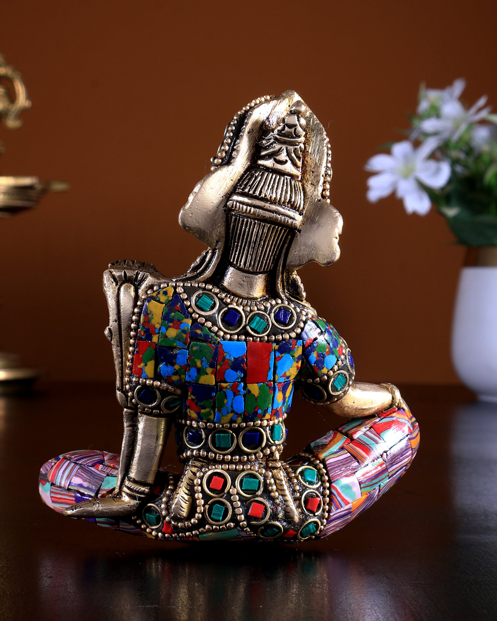 Invite divine strength and protection with this Pure Brass Indra Dev Murti featuring fine stonework detailing. Ideal for home temple, office desk and gifting. Size 4.33 x 3.54 x 1.97 inches (11 x 9 x 5 cm), weight 500 gms.