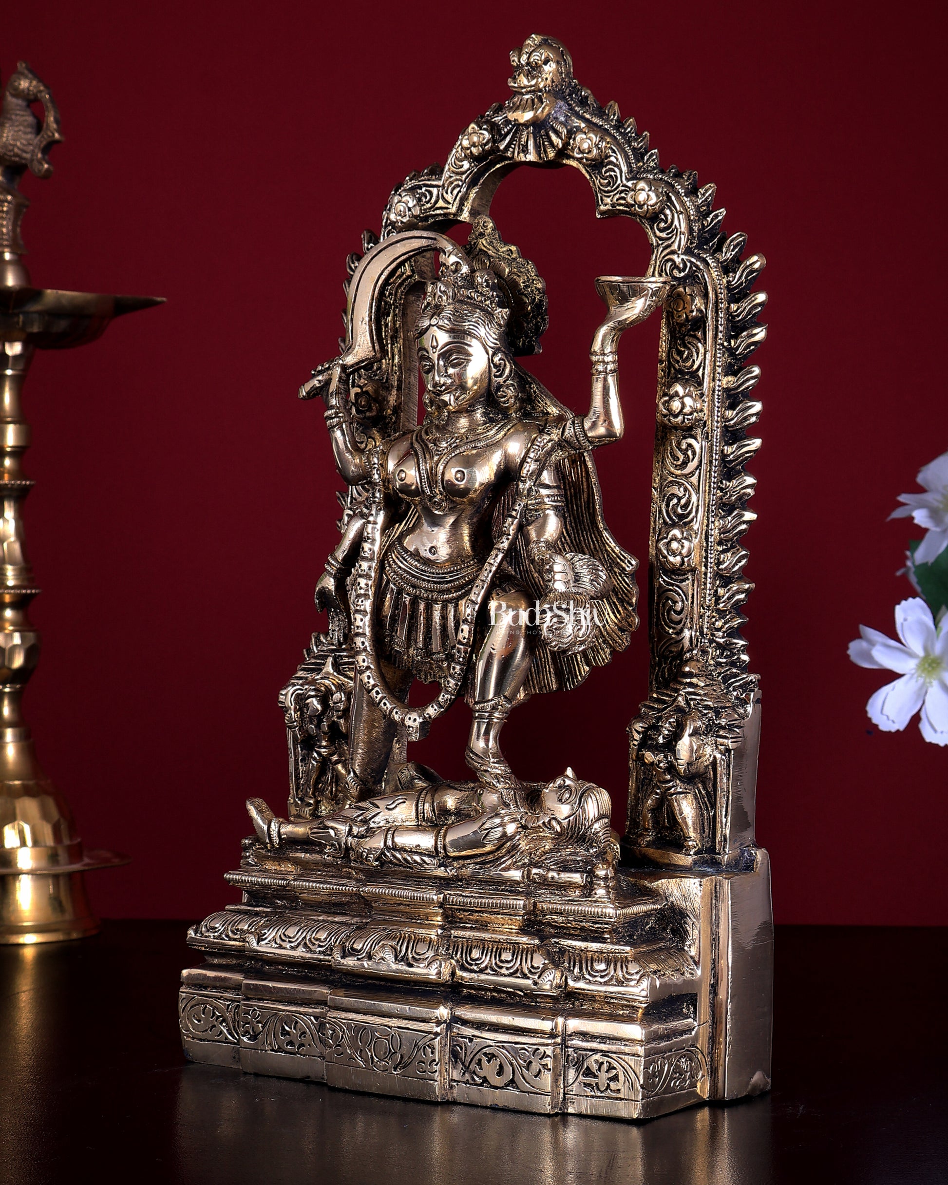 Bring home the powerful yet protective presence of Goddess Kali with Lord Shiva, beautifully crafted in pure brass. This sacred idol depicts Maa Kali wearing the garland of skulls, holding a large bowl, and standing gracefully with Shiva beneath her feet, symbolizing the triumph over ego and ignorance. The elaborate arched backdrop (Prabhavali style) enhances its divine presence, making it ideal for daily worship, pooja rooms, and auspicious gifting.