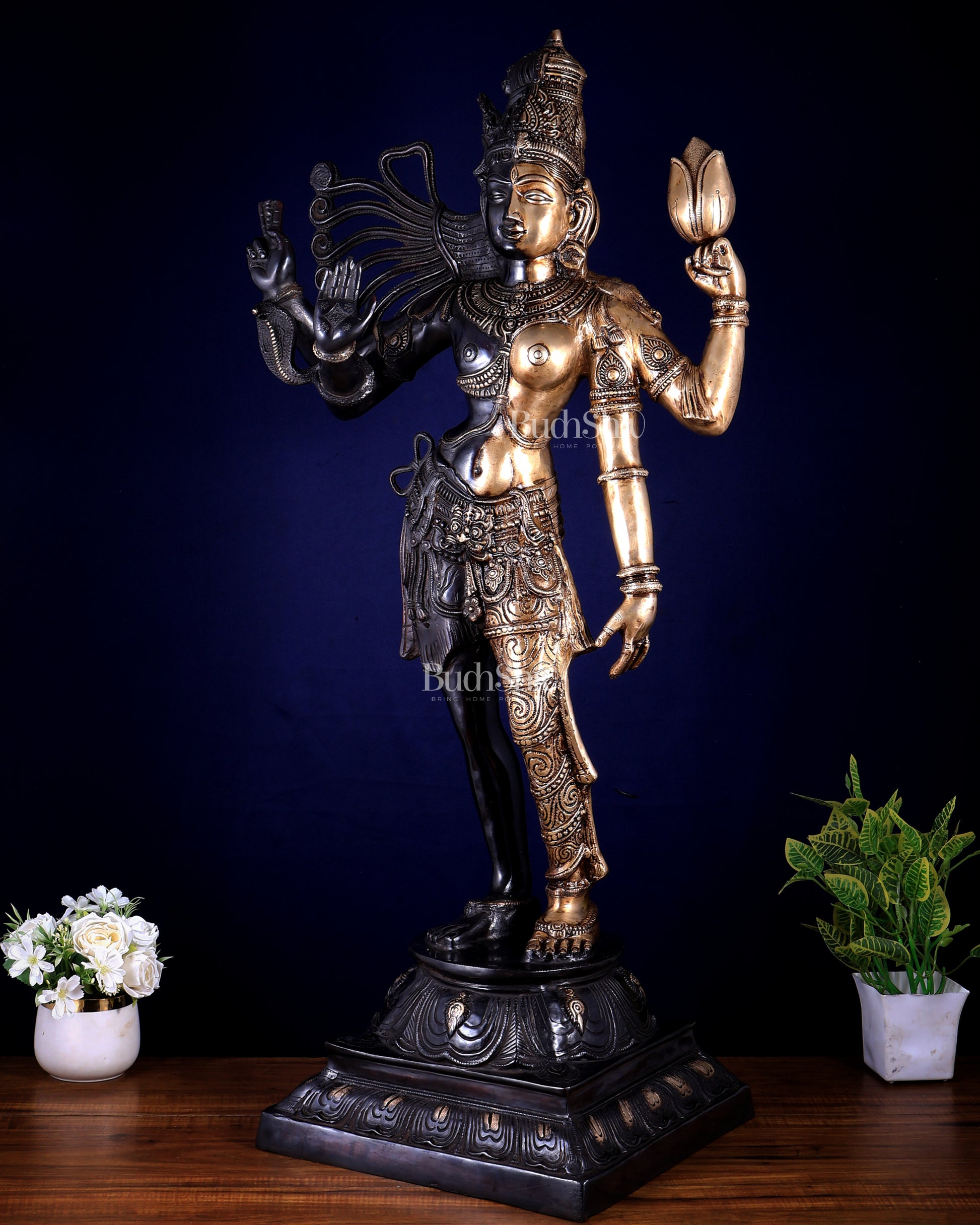 This majestic Ardhanarishwara statue, handcrafted from pure brass, represents the divine union of Lord Shiva and Goddess Parvati in a single form — symbolizing the balance of masculine and feminine energies, creation and dissolution, strength and grace.