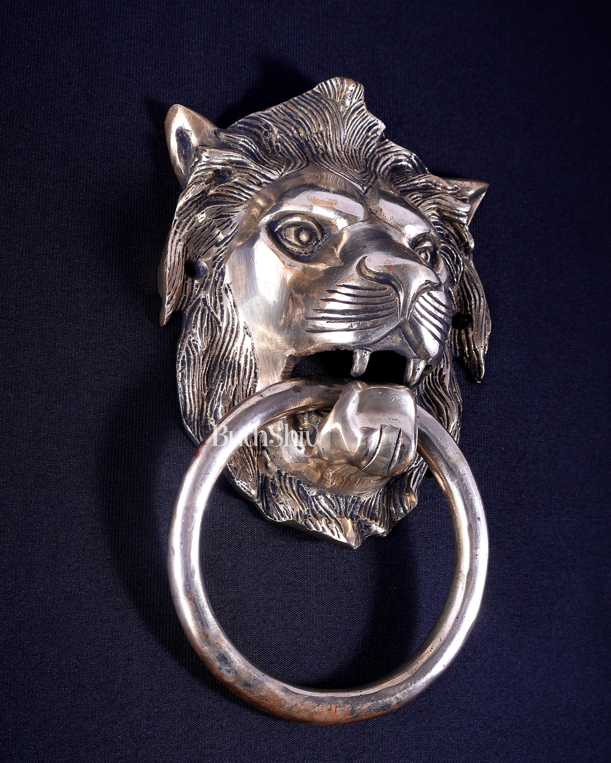 Crafted in pure brass using traditional metal casting techniques, the knocker features expressive facial detailing and a balanced form. Its classic design enhances wooden doors, temple entrances, heritage homes, and statement interiors, adding a regal touch to any doorway.