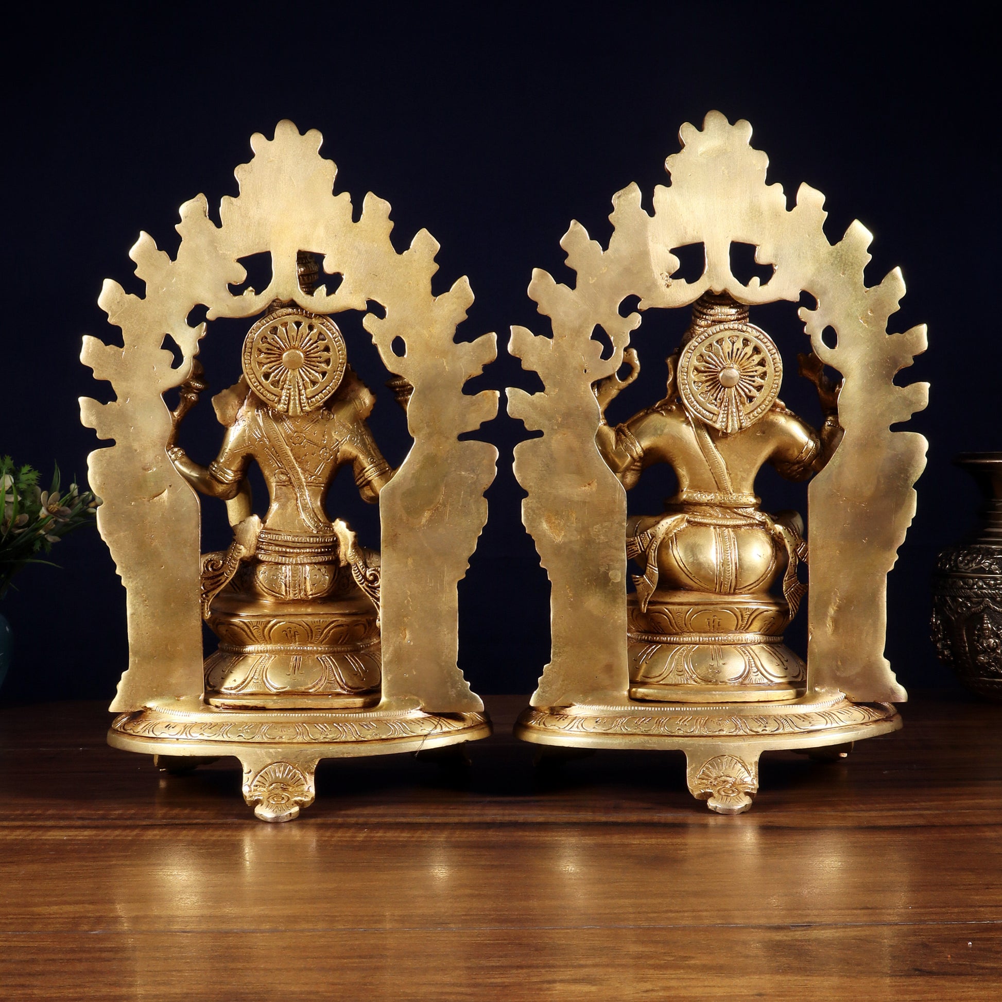 This exquisite brass idol set features Lord Ganesha and Goddess Lakshmi, each intricately handcrafted and adorned with a Prabhavali (ornamental arch) — a symbol of divine radiance and protection. Together, they represent a powerful blend of wisdom, prosperity, and auspiciousness.