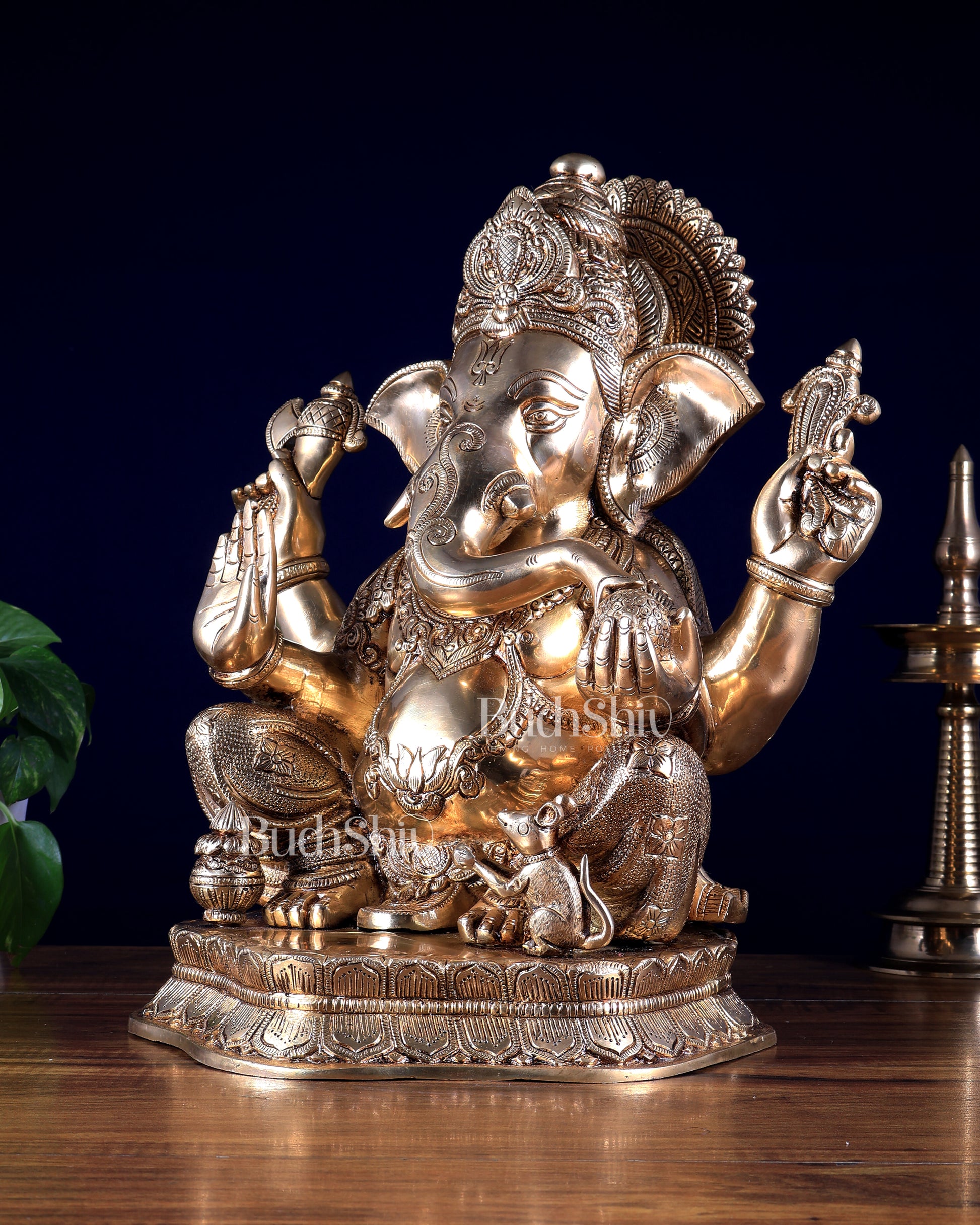 Pure Brass Lord Ganesha Statue with Enhanced Carvings 15.5 inch