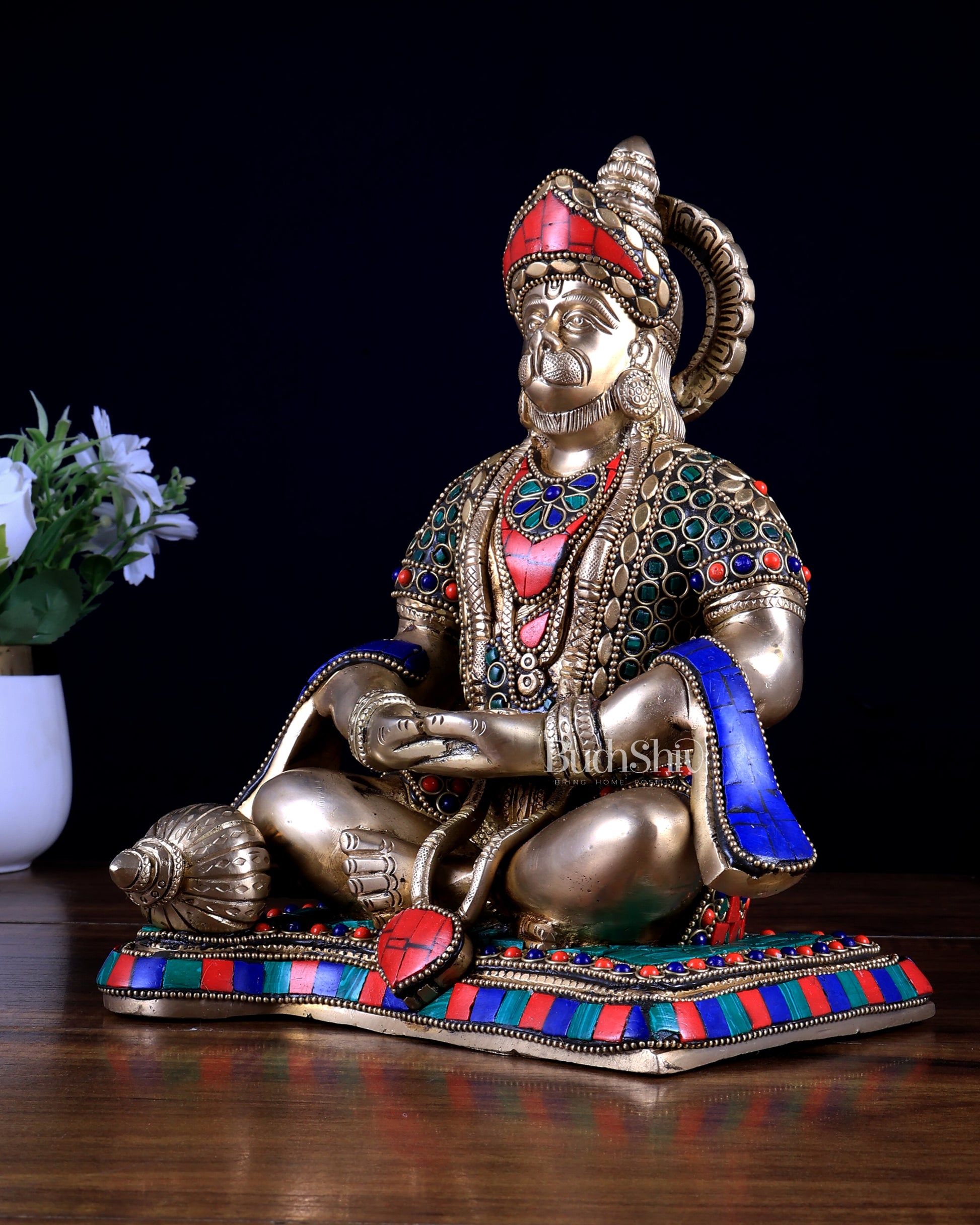 Pure Brass Lord Hanuman in Meditation – Meenakari Stonework (9.3 Inches)
