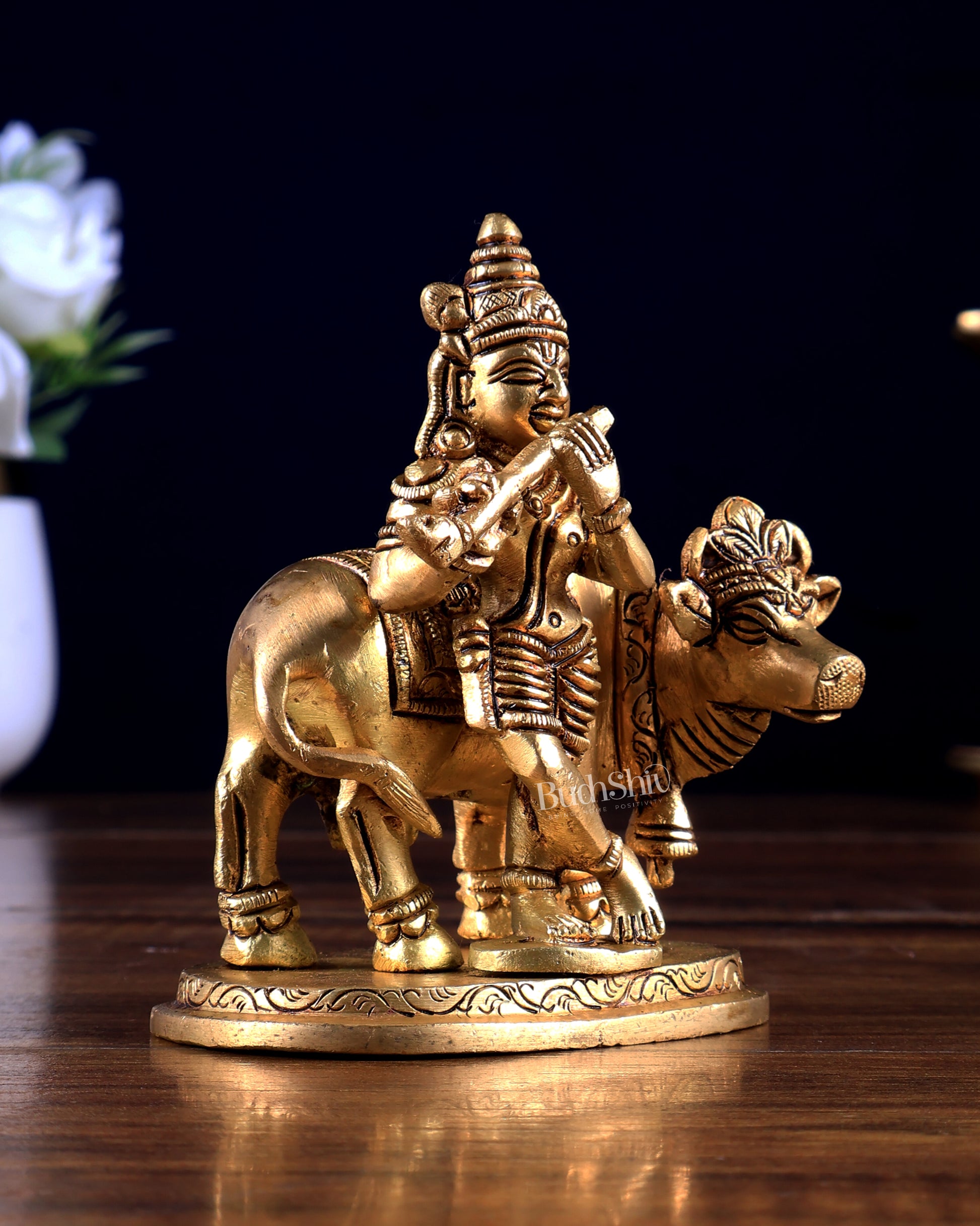 Bring home the divine presence of Lord Krishna with His beloved cow, symbolizing eternal love, compassion, and prosperity. Crafted in pure brass using traditional hand-carving techniques, this miniature masterpiece is ideal for home temples, study tables, car dashboards, work desks, or gifting for auspicious occasions.
