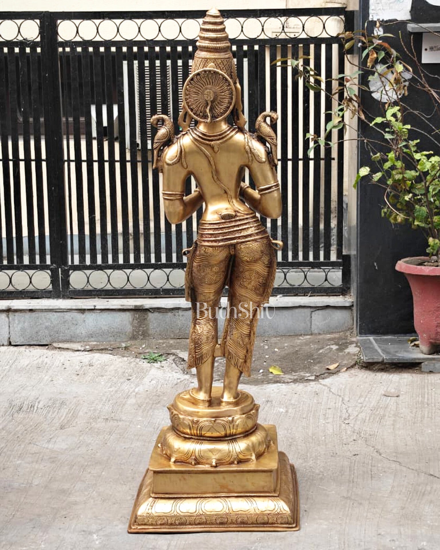 Handcrafted from pure brass, the sculpture features refined detailing, balanced proportions, and a dignified presence, making it an exceptional choice for home entrances, hotels, resorts, temples, luxury villas, offices, and cultural spaces.