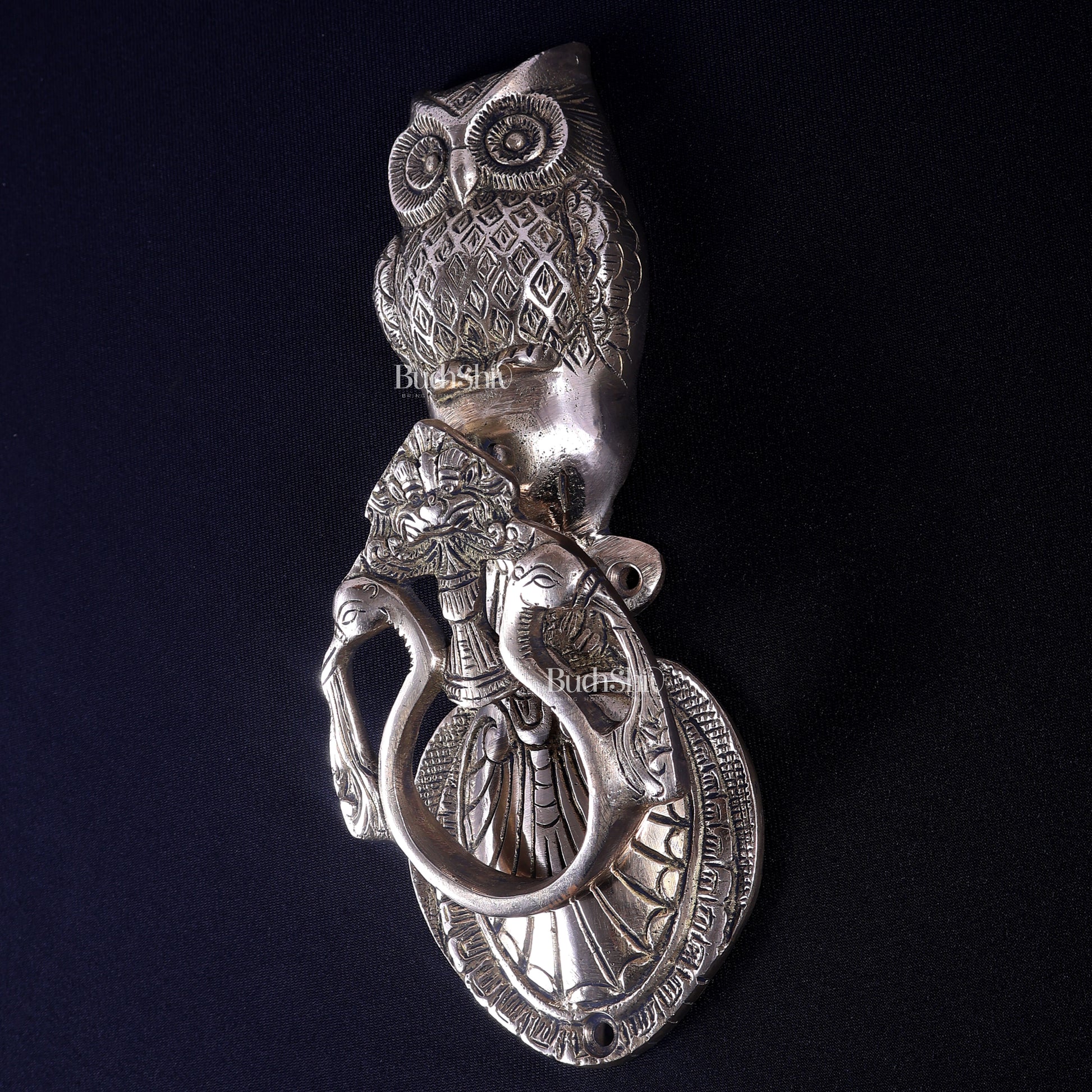 Handcrafted from solid brass, this door knocker features an elongated, detailed owl form that creates a striking visual impact. Its substantial size and weight make it ideal for main doors of villas, bungalows, heritage homes, and statement entrances, offering both functionality and decorative appeal.