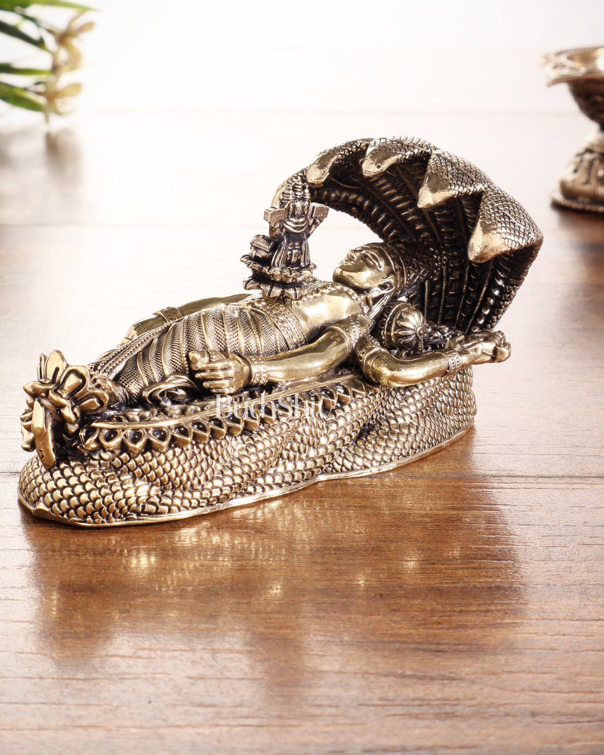 This intricate Pure Brass Idol features Lord Padmanabhan Swamy in a reclining posture, accompanied by Lord Brahma seated on a lotus emerging from his navel and the Shiva Lingam near his feet—beautifully capturing the divine trinity and cosmic creation.