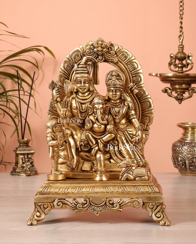 Shiva Parivar statue, crafted from pure brass. Measuring Height 12 inch, Width 9 inch, Depth 7 inch, this stunning sculpture weighs 6.5 kg, radiating spiritual elegance and cultural significance for your home or altar.